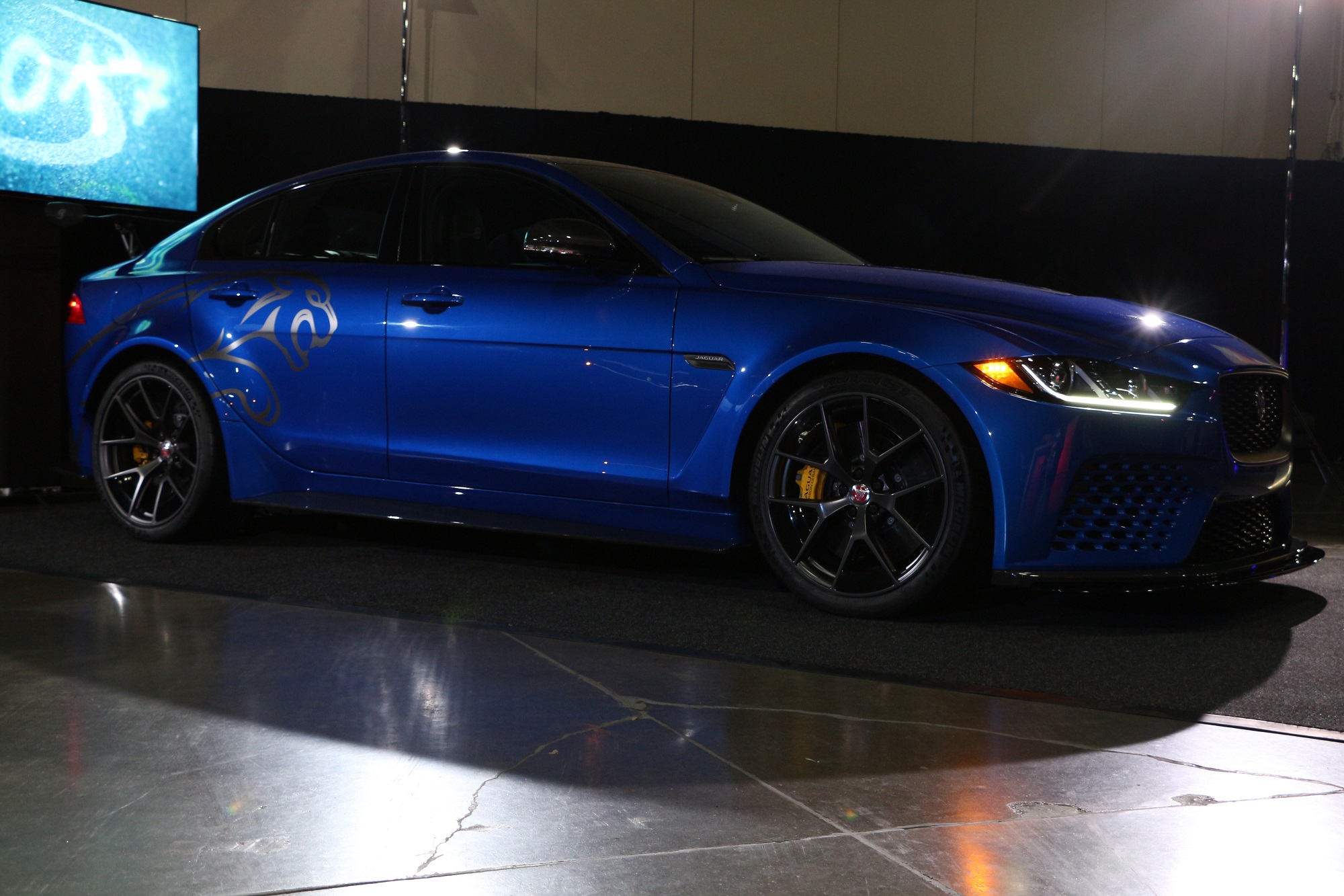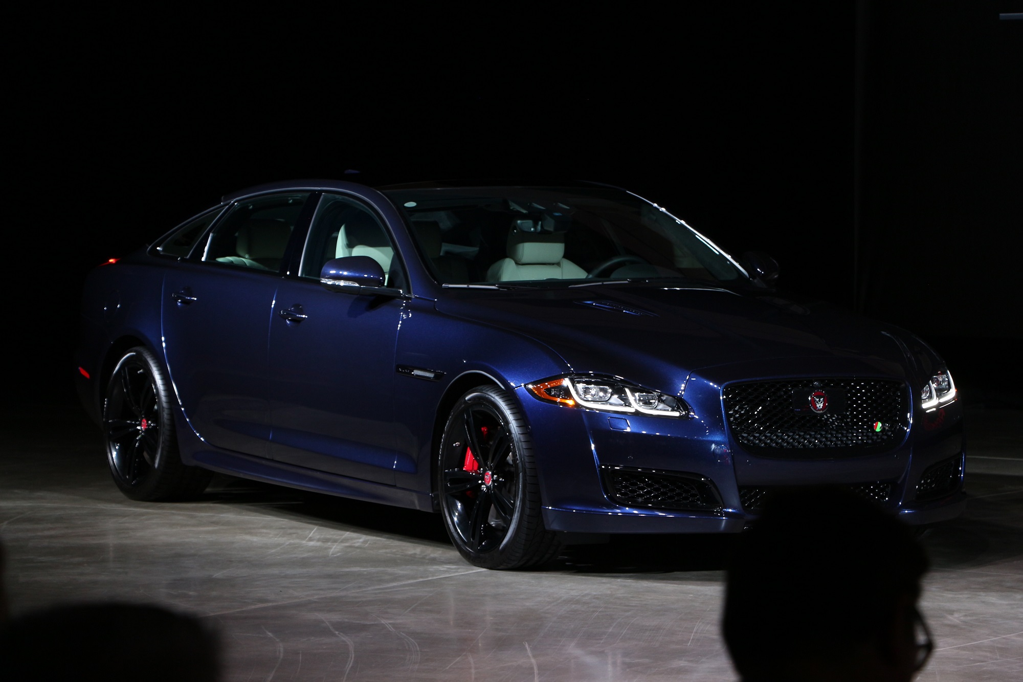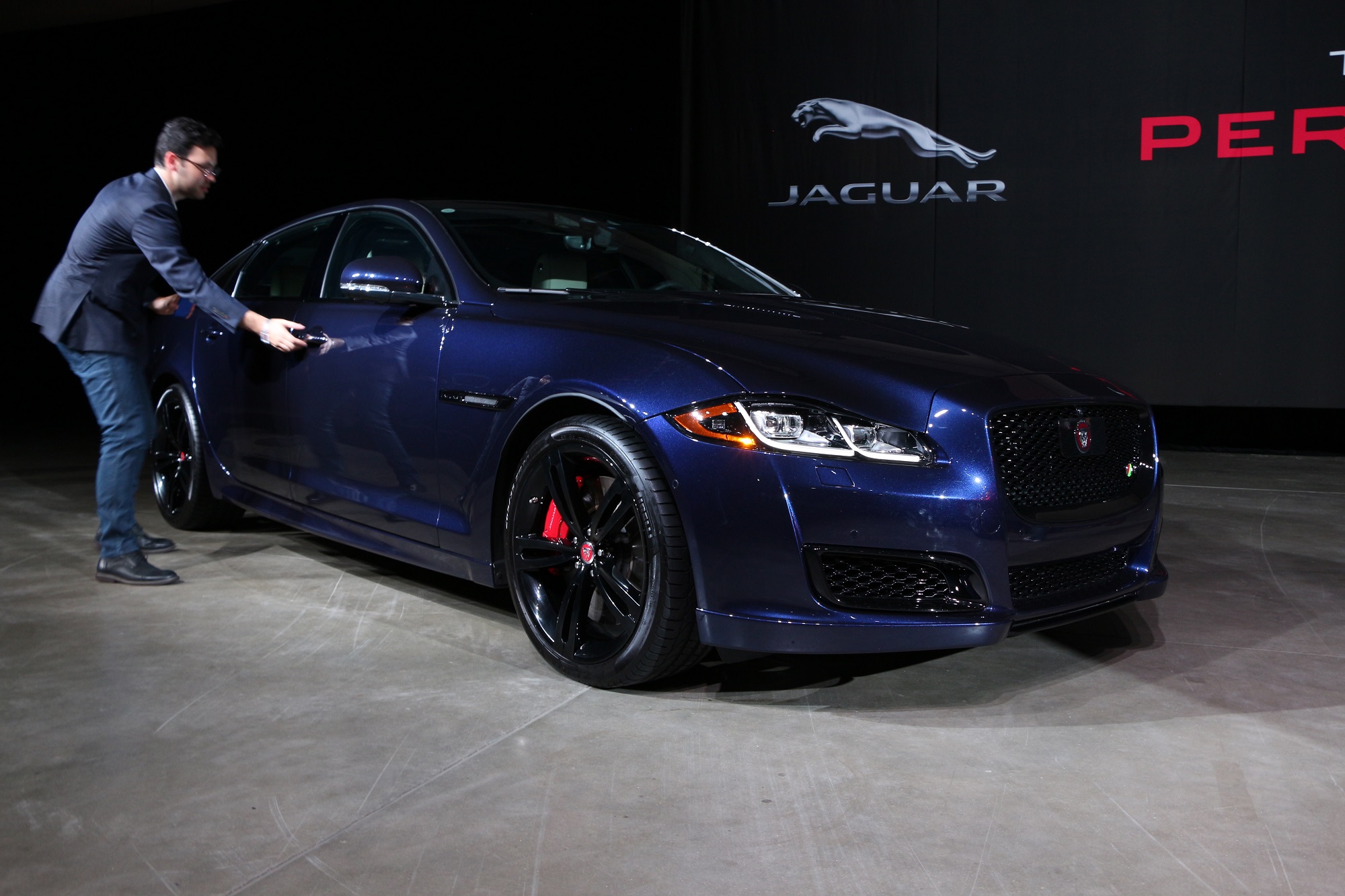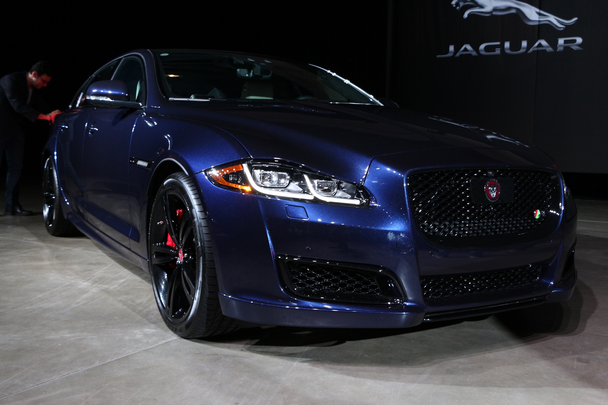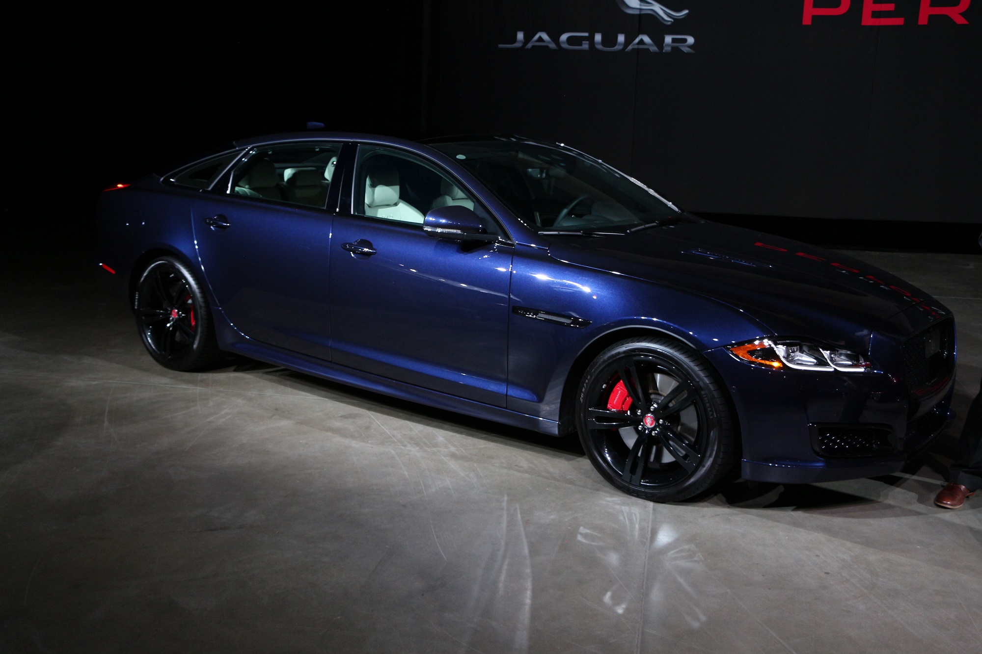 Beneath a sole bright light stood Joe Eberhardt, President and CEO of Jaguar Land Rover North America. Eberhardt let loose a flurry of facts and figures about the Jaguar brand. In short, North American sales are way up, JLR is capitalizing on Americans desire for SUVs and expect a lot of cool things to come. While he was on stage, Eberhardt pulled back the veil of secrecy on this sexy XJ sedan.