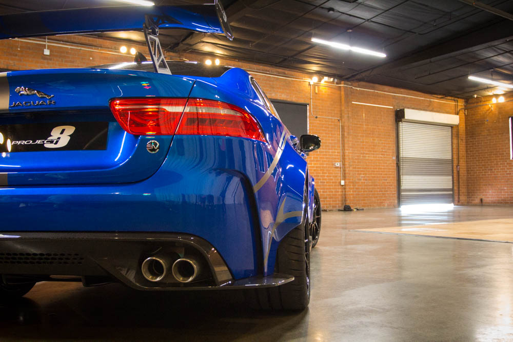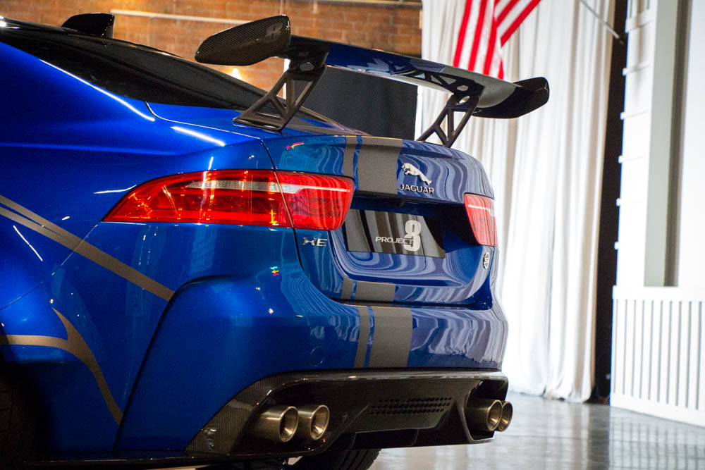 SVO brought the Project 8 to the Automobile Driving Museum in El Segundo, CA for our exclusive sneak peek. As soon as I walked up to the car, it was simply love at first sight. The standard XE is already a good looking automobile, but with the stunning blue paint and all the aero bits and bobs added, it made it quite hard not to stare in awe. I walked around the Project 8 a few times and couldn’t find an angle where it wasn’t pleasing to the eye.