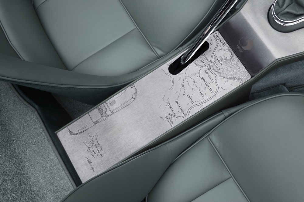My favorite addition is probably the engraved center console. Designed by world famous engraver Johnny “King Nerd” Dowell, it maps out the route famed Jaguar test driver Norman Dewis and marketing ace Bob Berry took from the factory to Switzerland, and each handmade piece took a painstaking 100 hours to produce.