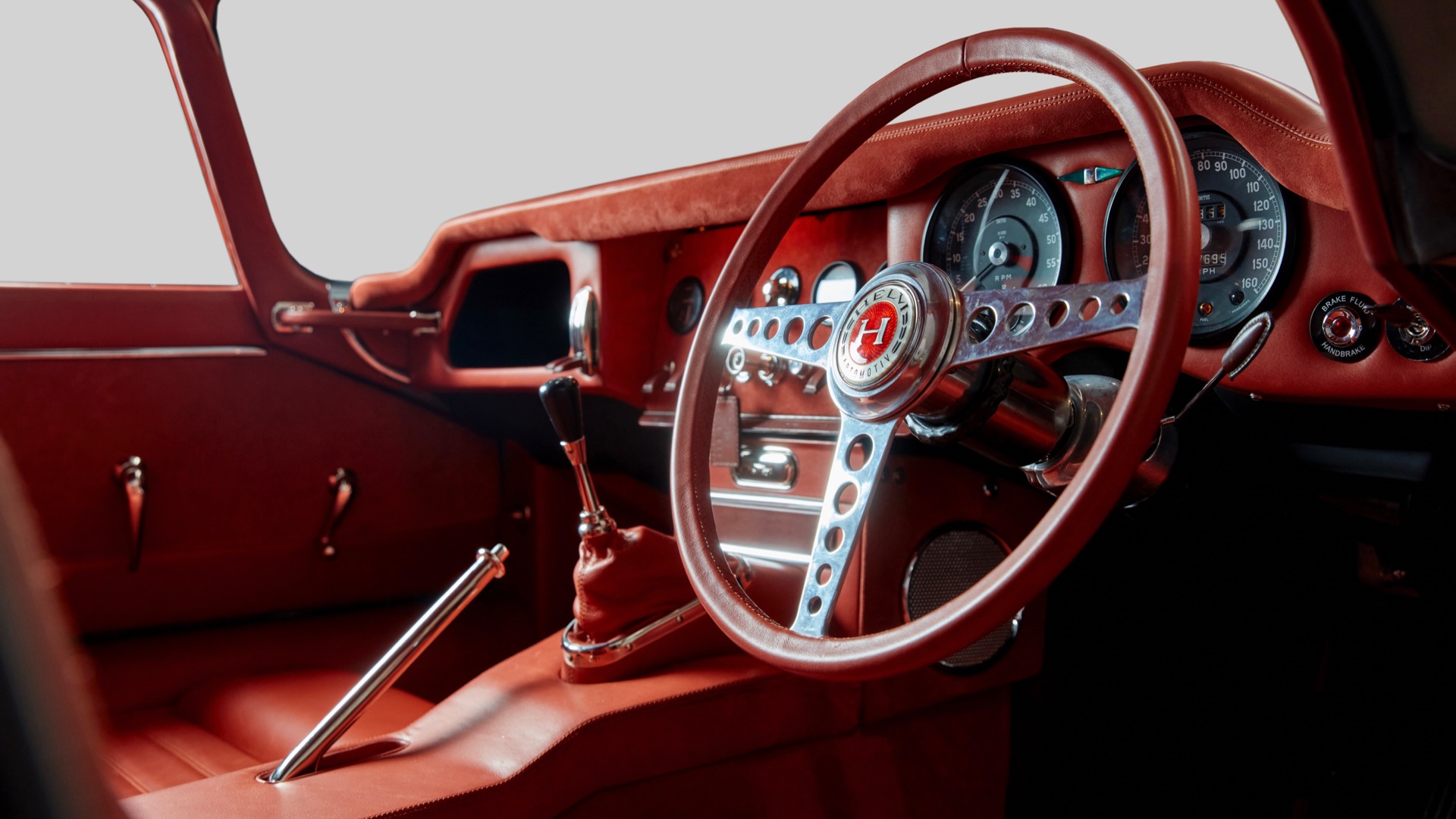 To increase rigidity, the chassis is fortified with steel, while the bonnet and door skins are replaced with handmade aluminum versions. Under the hood is Jaguar’s venerable 3.8-liter I-6, which along with being polished to the point of pornography, has been tuned to produce around 300 ponies. Power gets to the ground via a five-speed manual gearbox, and as you’d imagine, the brakes and suspension have been replaced with robust modern kit. So this machine will far outpace any Swinging Sixties-era example.