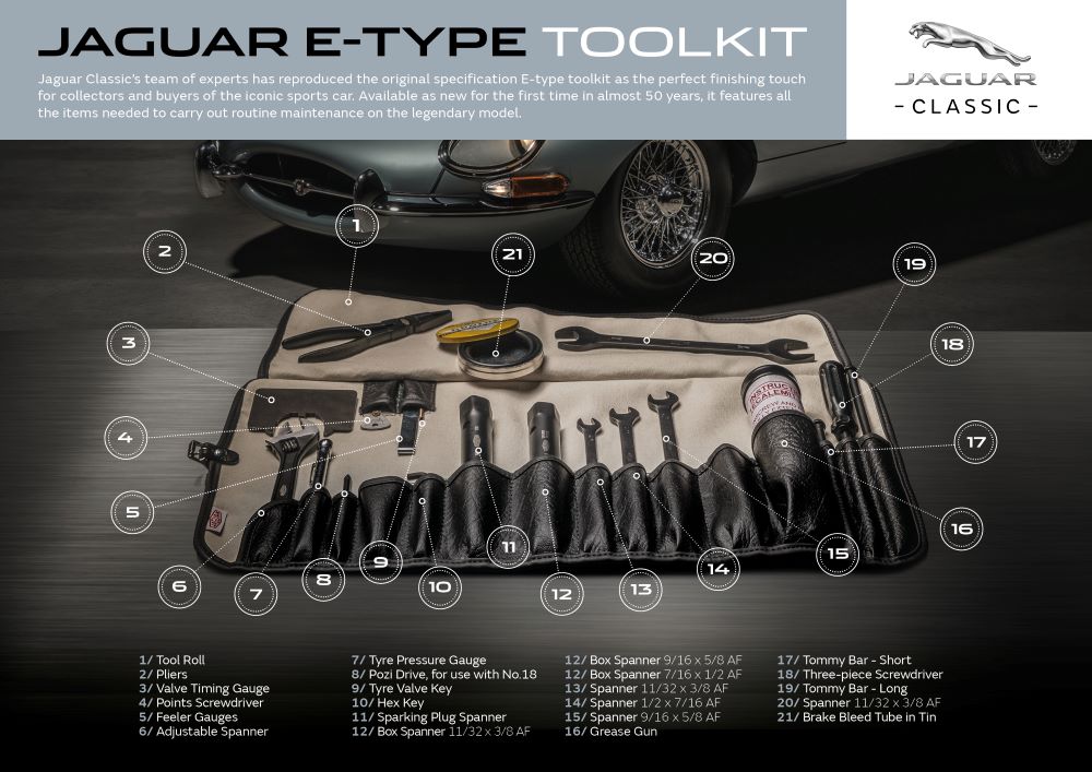 The E-type toolkit can be purchased directly from the recently-launched Jaguar Land Rover Classic online parts shop, which gives access to more than 50,000 Jaguar Land Rover Classic Genuine Parts and accessories including E-type body panels and the Jaguar Classic Infotainment System.