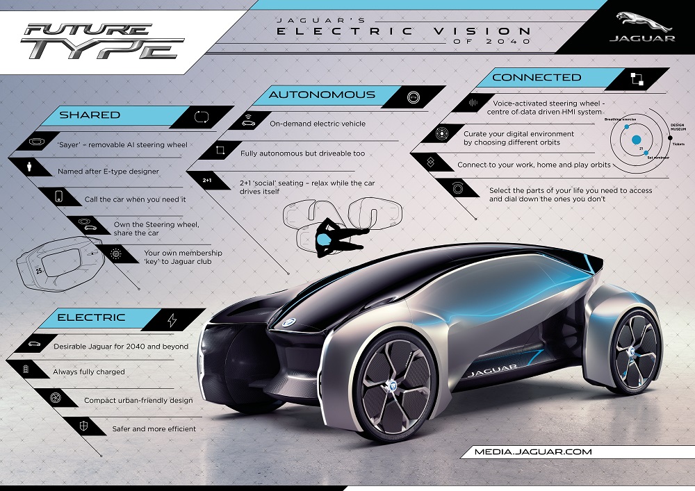 According to Jaguar, “The FUTURE-TYPE will communicate with other cars and use co-operative driving technologies. This collaboration will enable shorter distances between vehicles and make lane changing and exiting from junctions safer and more efficient. This will also increase road capacity and prevent accidents, while the narrow width of FUTURE-TYPE will mean it takes up less space on the road and in car parks.”