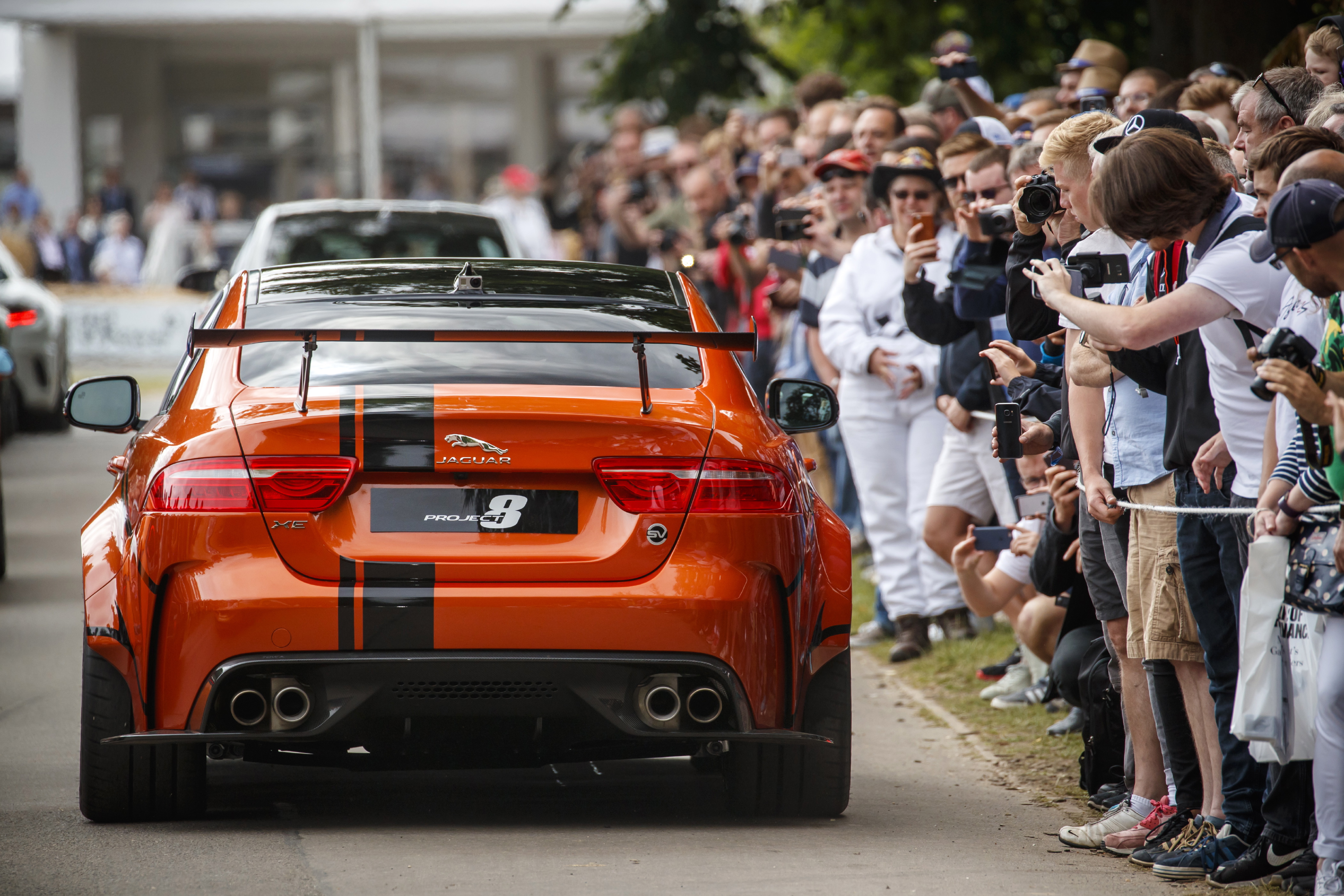 After debuting at this year’s Goodwood Festival of Speed, it’s now officially a showstopper – the overall Michelin Supercar Paddock Showstopper of the event, to be exact. According to Jaguar, “As the only four-door car in the Michelin Supercar Run, the Jaguar vehicle faced formidable competition in the 50-car paddock, but voters in an online poll hosted by Michelin UK singled out Project 8 as one of the six most popular cars of the weekend, qualifying it for the overall Showstopper final on Sunday afternoon.” A panel of six judges, which included former British Touring Car Championship winner Tim Harvey, British automotive journalist and broadcaster Jon Quirk, and drift racer Vaughn Gittin Jr, went on to award the all-wheel-drive super sedan the second annual Michelin Supercar Paddock Showstopper Trophy.