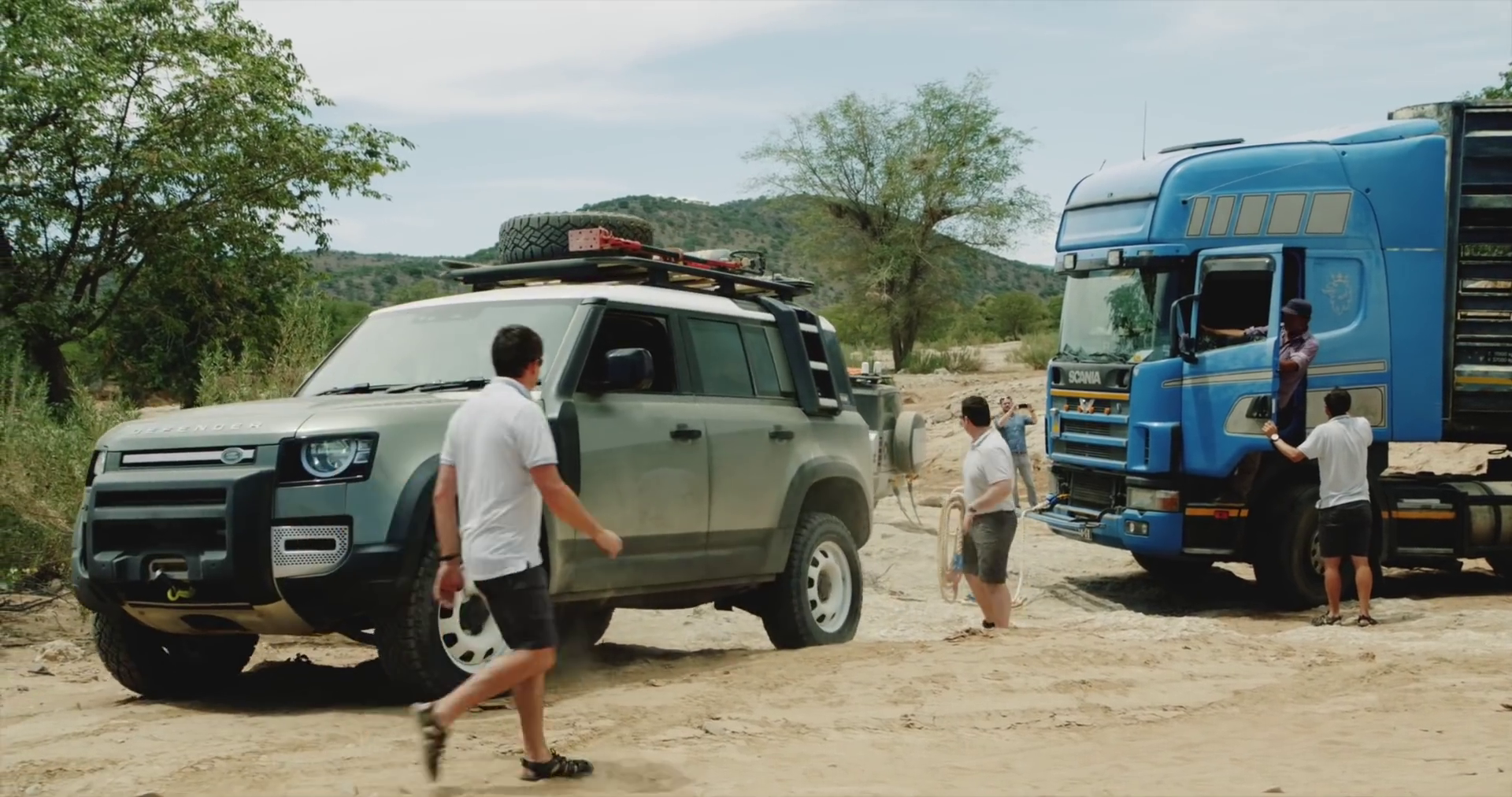 As the story goes, Land Rover took two Defender 110 models out to Namibia, a country in southwestern Africa, as part of a run-up to the official launch. When they got to the Namib Desert, they encountered a trucker who had been stuck there for several days with very little subsistence. Ultimately, the two Defenders freed the truck from the riverbed relatively quickly. At first, they’re nearly side by side. But they switched to conga line setup after initially freeing the truck from where it was initially stuck. Presumably, that allowed the trucker to guide himself through the easiest way out of the riverbed, which is the route the Defenders also took.