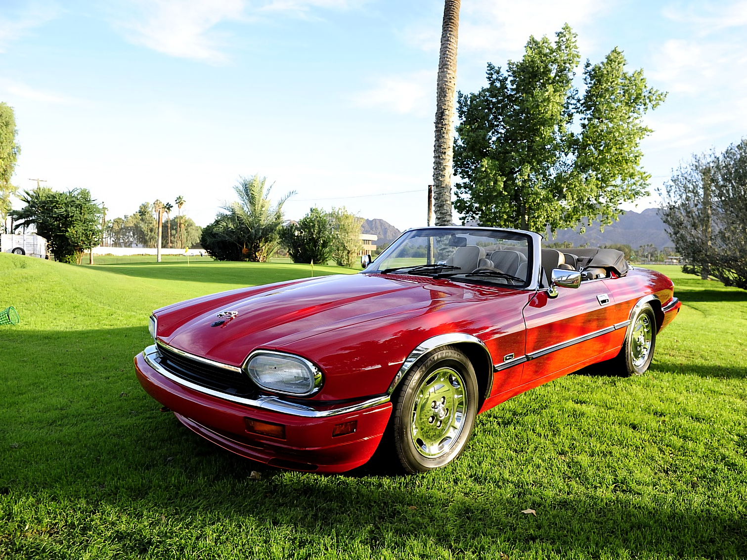 First up is a 1996 Jaguar XJS convertible, pretty close to the end of the line for XJS production. It’s resplendent in a bright red hue that will fit right in here in Palm Springs, but likely draw some attention back home. The chrome wheels and trim certainly add to the allure.