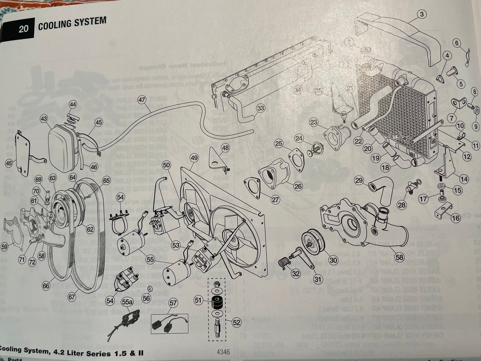 Thanx for the diagram. No, the one to overflow res is #47, and is in place on my car. The hose I’m asking about is not shown here. I’ve looked at dozens of pics and drawings and have yet to find it. I did see a post about an air bleeding hose somewhere, but it was vague…. The post was about filling the cooling system, not specific enough. Mine goes down from thermostat, then torts back, under engine, on opposite side ….passenger,right, side. Overflow is on left,driver side.