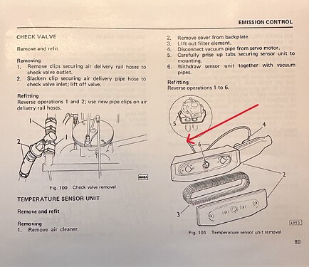 Ok, to my question: I had to source new air cleaner temperature sensor units. I want to reinstall them to improve cold performance (and for originality). The originals were missing, but I’ve figured out that they were the same as AC Delco part #6484242 used in many GM cars of the era. The questions is: where on the engine do they connect for their vacuum source? The manual is not helpful because it presumes that when the part is removed, the mechanic will take note of where it is connected. The red arrow in the first image points to the vacuum line in question.