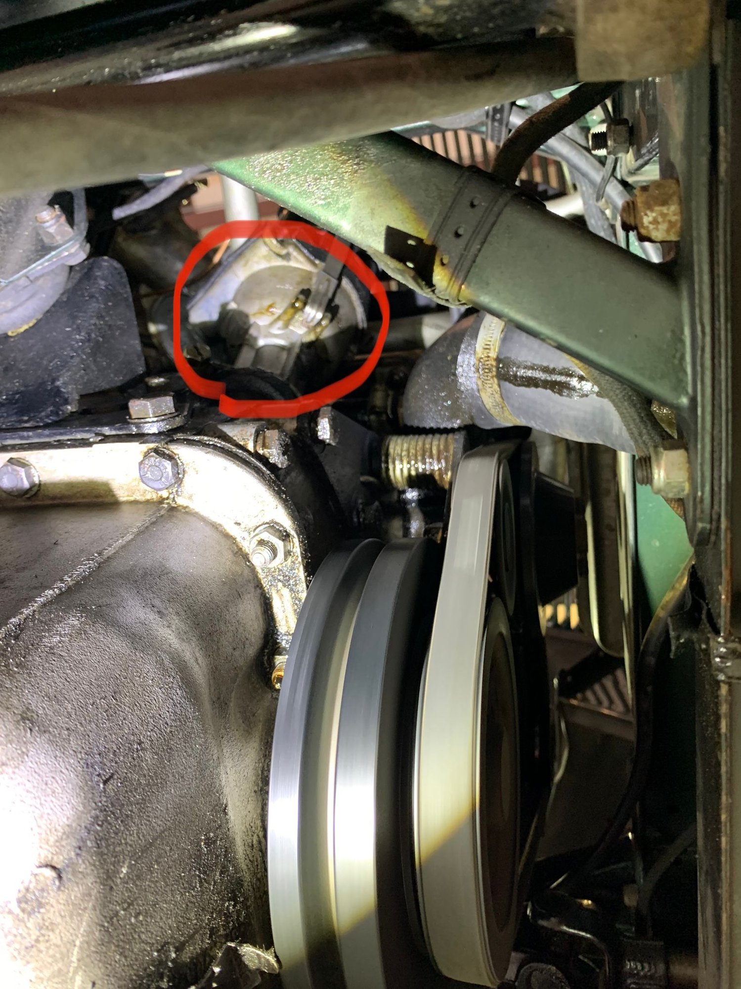 The other leak seems to be coming from somewhere above where the oil pan meets the engine block in the forward section. Another photo for reference. I circled where it might be coming from since it’s wet up there. I originally thought it might be the oil pan gasket, but that is good. I’ll clean it better to get a more accurate read. Is there a common area up there that tends to leak? Also, the fan belt tensioner spring is pretty oily too. Anything you guys think I should look at in particular? Thanks.
