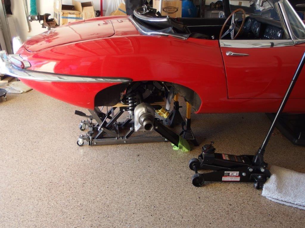 Ready to lift IRS with ATV jack - Car is raised front and rear and is approximately horizontal. Note front shock not yet installed. Wait until after bleeding brakes.