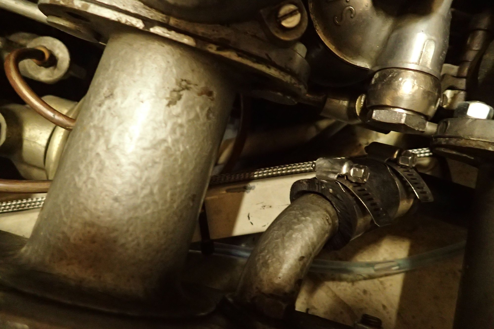From the oil connection, it comes up the block in front of the front carb (photo 1)