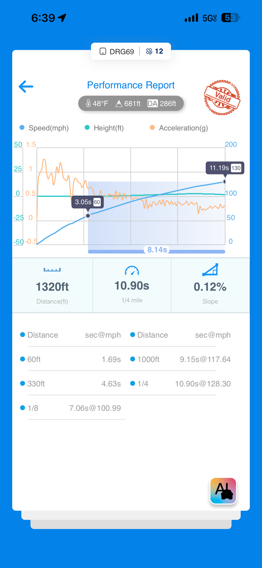 On our car at 1300 DA we did 10.88 so a little faster than your 10.89 while fully letting off gas at 1000ft for comparison