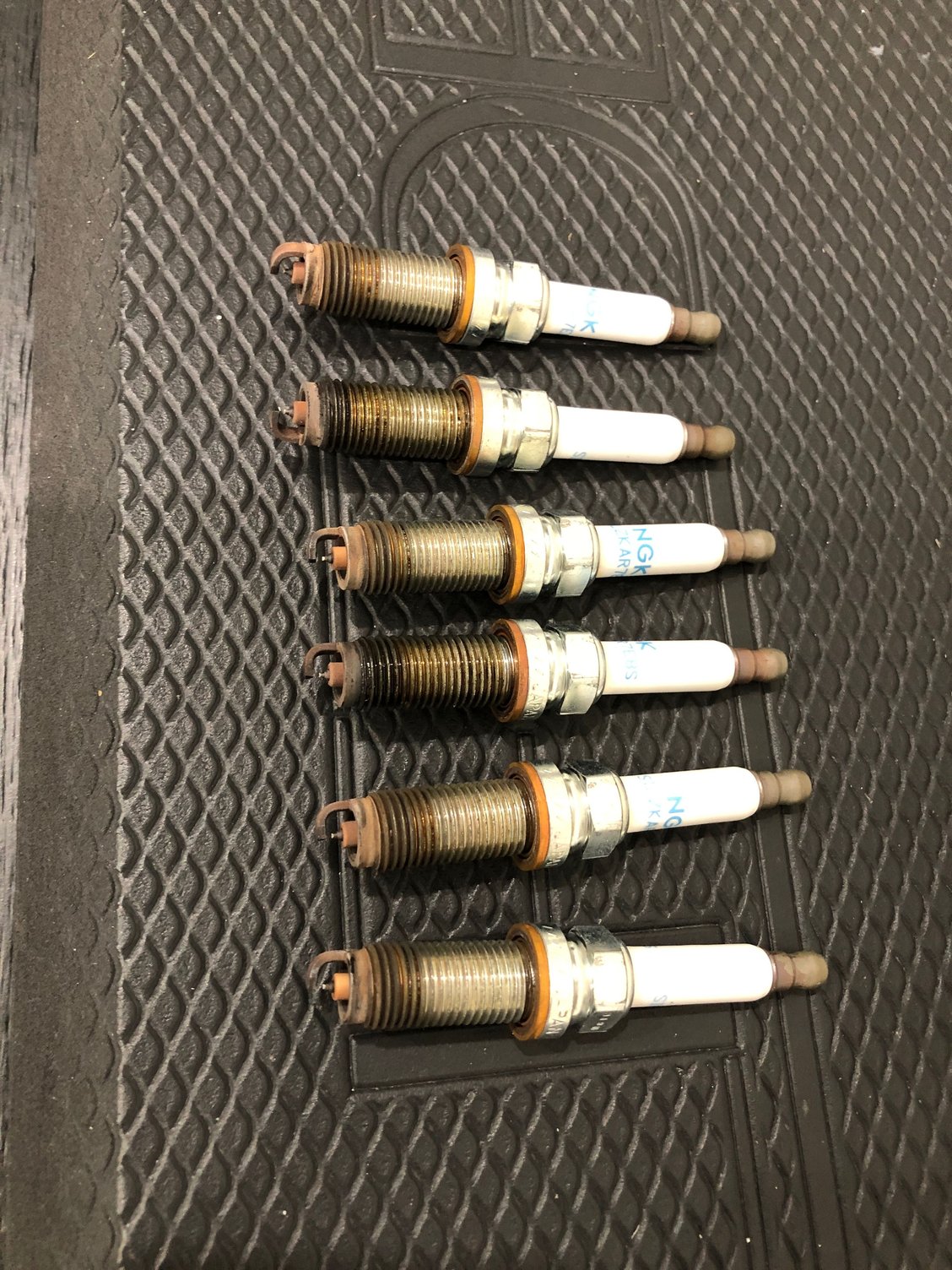 I also was at the yearly service time for oil change, etc. (car was right at 50,000 miles; 2018 MY). I decided to change the plugs as well even though iridiums should last longer. The plug change went very uneventful. I replaced with the factory NGKs I purchased on Rock Auto. Here is a pic of the plugs I removed (I did not keep track of the locations), but nothing looks out of order, maybe slightly running on the rich side. All of the iridium tips are there, etc.