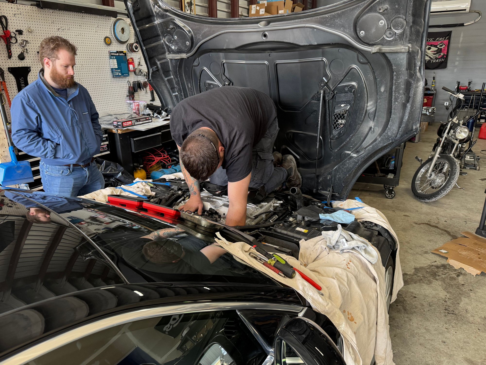 We dropped The Jag at my friends side hustle shop last night so it would cool down. We started tearing it down at 9 am. Gage and my son did most of the work. I helped with the symposer delete and changed the supercharger oil. Had everything buttoned up and burping the coolant by 3pm. Helps when Gage does at least one Landie a month at his day job.