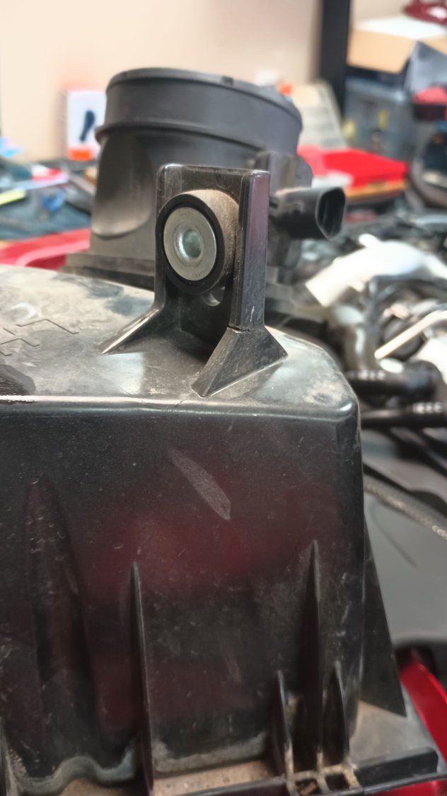 I was trying to figure out what I was going to do with the left side air box, when I noticed that its mounting bracket is cracked. Not the whole way through, but enough that replacing it would probably be good. The left side bumper is where the car had an impact in its past. This is hopefully the last remnants of that damage.