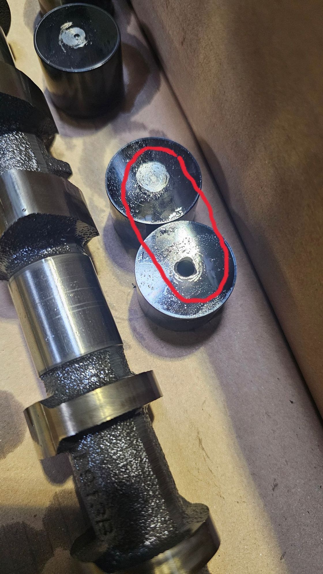 Several of my tappets show signs of wear, see attached pics. I haven't really been given a good explanation of what could have caused this, but i have definite valve damage as well due to one of the values piercing the top of one of the tappets - this tappet moves freely and i assume is the most significant contributor to the tick i am hearing!!