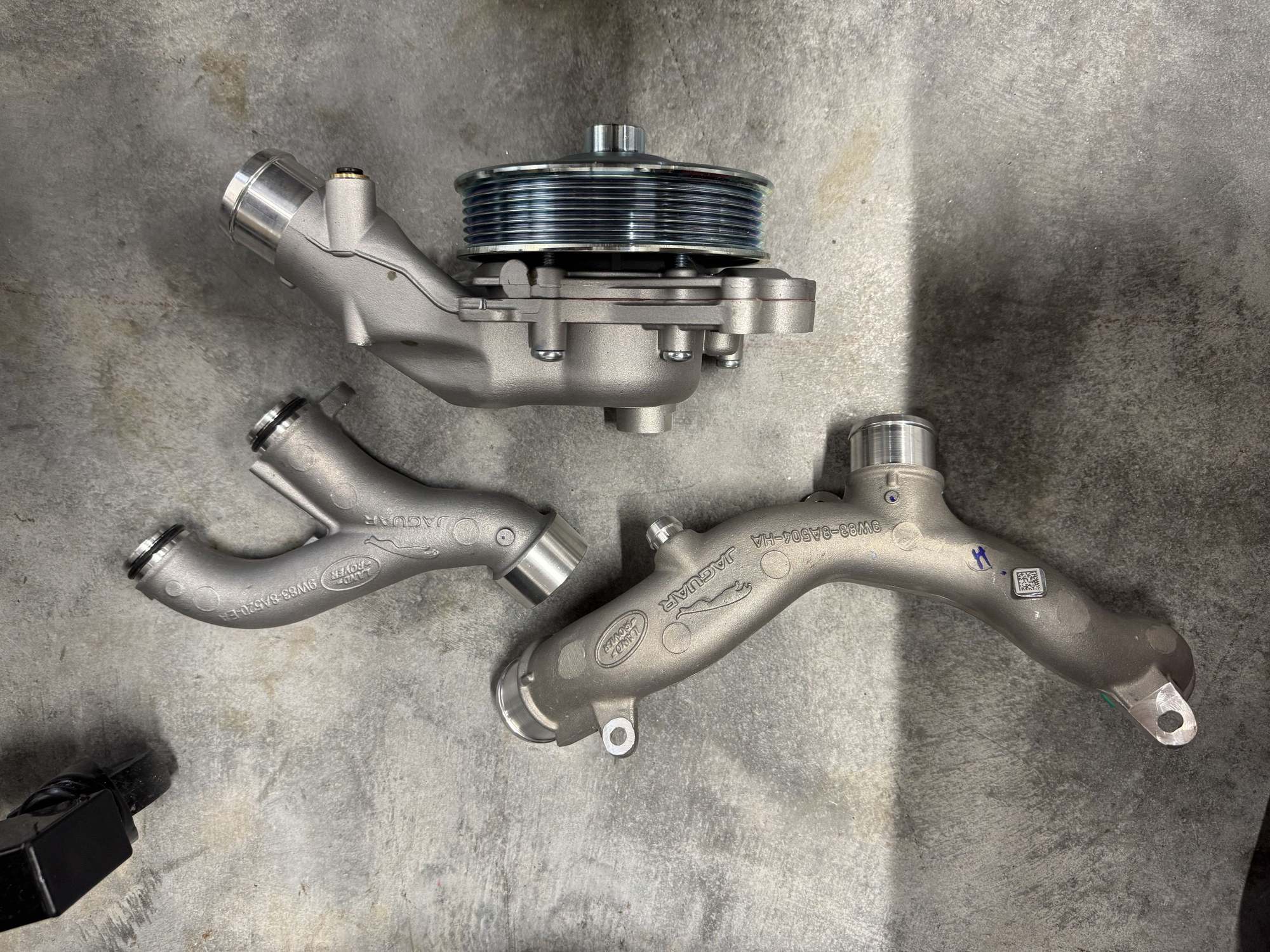 WSHudds the current water pump from JLR has a part number that ends in 3909. They all had Aluminum housings. JLR has revised the WP at least 5 times since it's original release in 2009-2010. My original 2014 XJR WP started leaking at around 30K miles and I had the WP and the 2 front plastic pipes replaced under warranty.