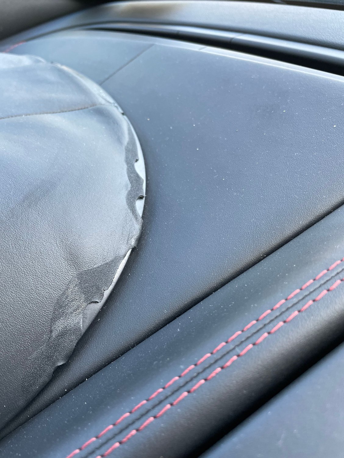 i have no idea how the gauge cluster got to that state, first time i noticed it was already a few months after taking her home, On the side where i took the pic, it looks like some kind of chemical damage, but the leather underneath is completely fine?? The center edge where i didn’t take a pic looks more like a typical leather lifting and shrinking, and the center of this leather is also lifted.