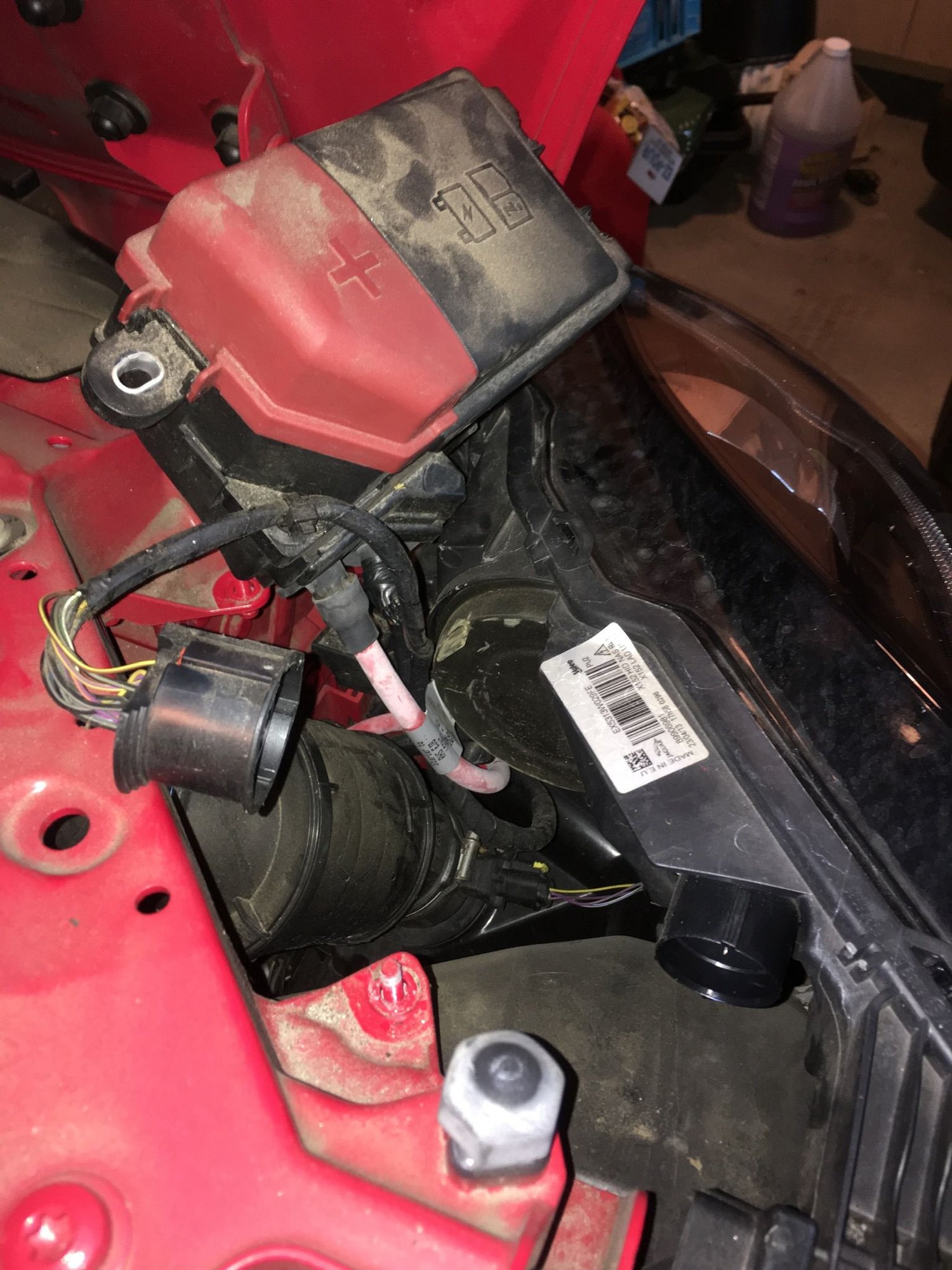 Passenger side: the headlight has a rubber cover on its back. The bulb is behind it. Its access is blocked by a black/red fusebox.