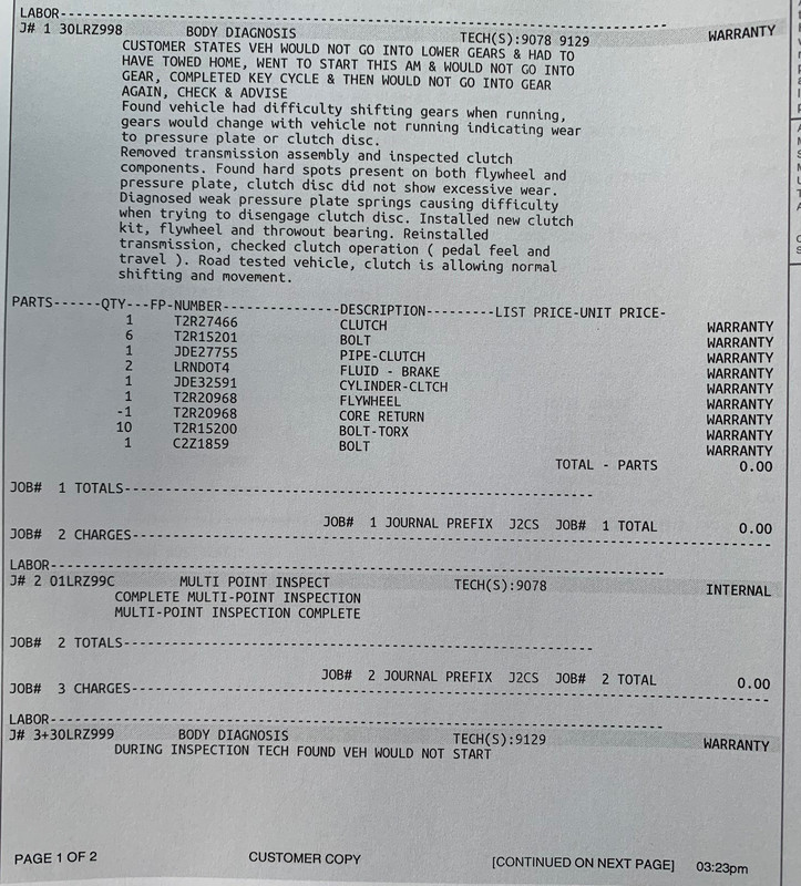 Here's the latest update. On April 21st I received a text from the dealership saying "it's having trouble going in to gear. The is indicative of a worn clutch & clutch disc/pressure plate. Unfortunately clutches are considered a wearable item & is not covered under the factory warranty. I would need to order the parts and can have them here in 1-2 days. The total for the repair would be $4,170.68. Please let me know if you'd like to complete the repair while it's here." Needless to say, my blood began to boil. Then I decided to call and have a calm conversation with my service advisor. I explained to her that I've been driving manual transmission cars all of my life and have never even had a clutch wear out. I told her that I had a 1993 Nissan 240SX that I sold with 110k miles and a 2007 Subaru WRX that I sold with 90k miles, both with the original factory clutches. I went on to explain that I drive my F-Type just the same and don't rag on it. I also told her that the first clutch was previously replaced before I even got to 10k miles. She didn't know that and asked that I allow her to check in to it and call me back. She called back a while later and said that she had spoken with the shop foreman and they felt like it wasn't simply the clutch wearing out. She said that they'd have to take it apart to examine it and would then have to be careful about documenting what they found, but it should be covered under warranty. I didn't press them on time. It took about ten days to order the parts and do the repair. I picked it up yesterday. It seems to be driving perfectly.