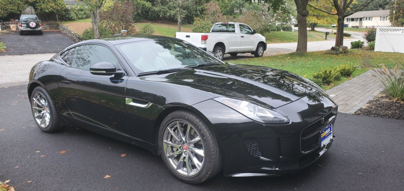Good morning! Finally took possession of a 2016 F-Type Base Coupe! I had been actively looking for nearly 4 months and took delivery (literally) just yesterday. It's an Ultimate Black (1AG) coupe with black interior. 13000 miles. No build sheet yet, the options as best as I can tell and in no particular order: leather seat inserts, black package (interior and exterior), glass roof, vision and climate, 18" Vela wheels (polished by previous owner), active sport exhaust. So, first impressions. This is the most visually balanced car I have ever owned. The rear 3/4 view is fantastic! It may seem strange to first talk "looks" rather than performance, but I think I've stared at it more than driven. The performance was a given. It corners and accelerates better than my 57 years will attempt. Last night, bringing it home from our restaurant, I got on it because my brother in law wanted to "hear it go". Pretty f'n surprising! But I'm older, and the thoughts quickly turn to responsibilities and consequence. I purchased it through Carmax. It had appeared on their app in Riverside California and the miles clinched it. I didn't want another black car, but 13k swayed me, and in the end, the entire Carmax experience was on of the easiest ever. This is the 29th car I've bought in 40 years, and it was the best "dealership" buy in years. Fair price, 24 hour test drive, flexible delivery, it was brought to our restaurant, most of the papers were e-signed and copies provided. It showed up fueled, polished, registered and insured with no doc fees. There it sits, under the carport, in my wife's spot, where my food smelly butt won't drive it till probably Monday! Hopefully everything works out, as the Greeks say, ptoo ptoo ptoo!