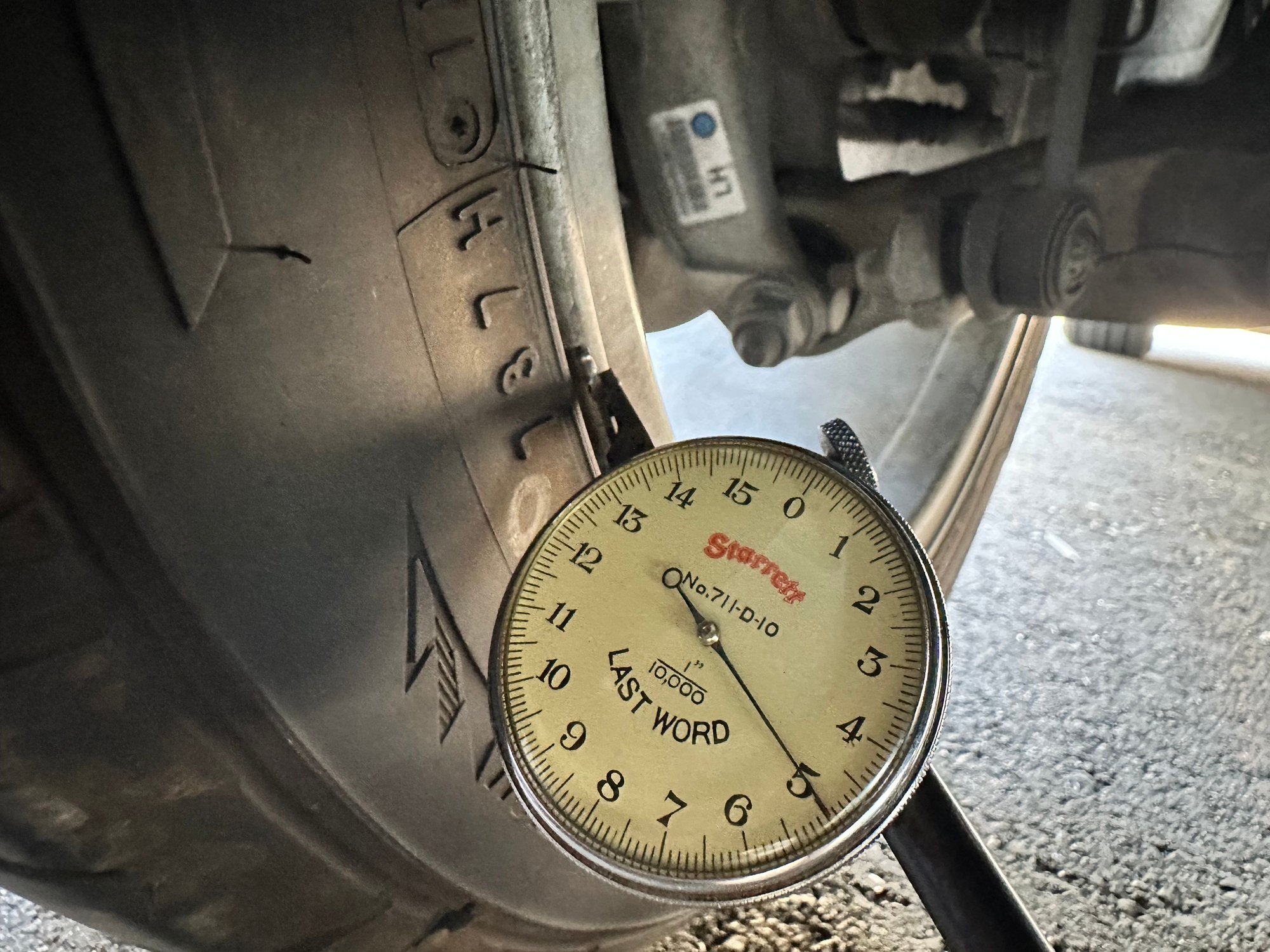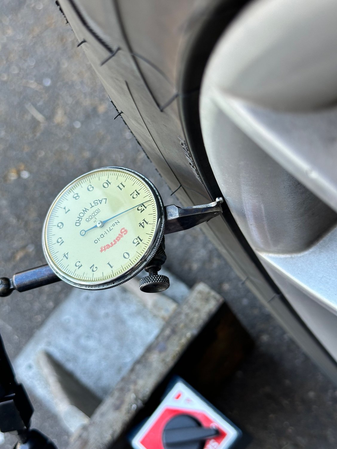 Did some tests, set up a dial indicator on a few spots as shown. The drivers side rear, has about 2mm of wobble- unclear if that’s axial or radial. All the other ones have about .5mm- I did this mounted on the car, and spinning them by hand, so I’m going to say that the .5mm is a margin of error.