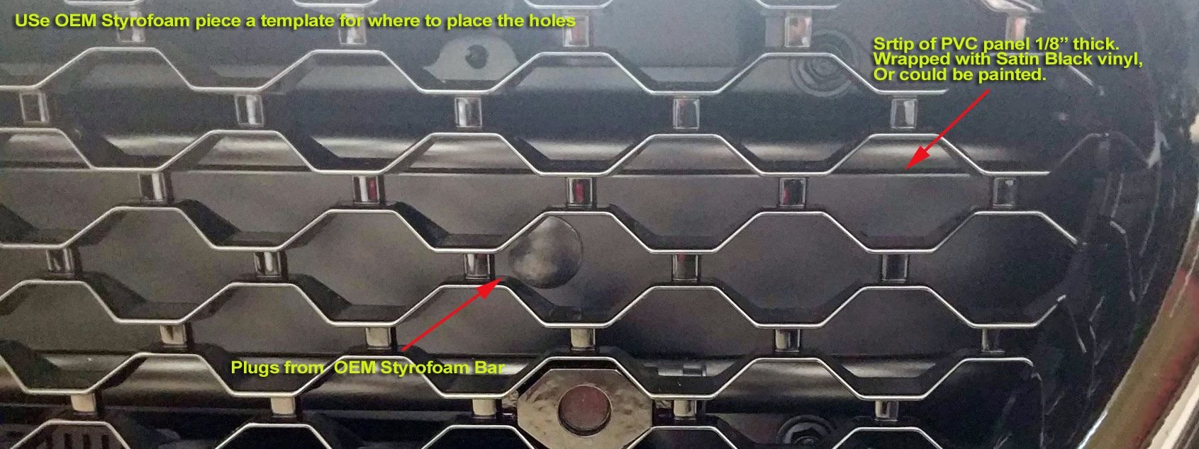 I ended up spraying behind the grille"Satin" black as opposed to Flat, and feel in blends well/better? I also was not loving all of the holes/business on that bumper bar, so used a 1/8 inch by 3-inch piece of white vinyl/PVC and wrapped it with satin black and used the same holes and pins as the large styrofoam piece and it cleaned it up. I had noticed in OEM Project 7 cars...the grilles did have a cover on that bar. I also used some 470-ohm resistors and LED bulbs and made some nice bright white eyes for my badge, also painted Black and White. I fiddled around and took all the wrapping off of the sensor wires and ended up using shrink-wrap and black zip ties, as I was not sure about the glue holding. Used a couple of spots of hot glue to secure sensors. Also sanded and wrapped gloss black for the holders to match the grille material...and used various connectors so the grille can be removed and the sensors can stay in place. Also realized (at least on mine), I had to trim the bumper cover where the bar used to reside as it prevented the trim /surround from going in flush (also how I broke a clip ) Other than the clip snapping...not too bad and happy with the results.