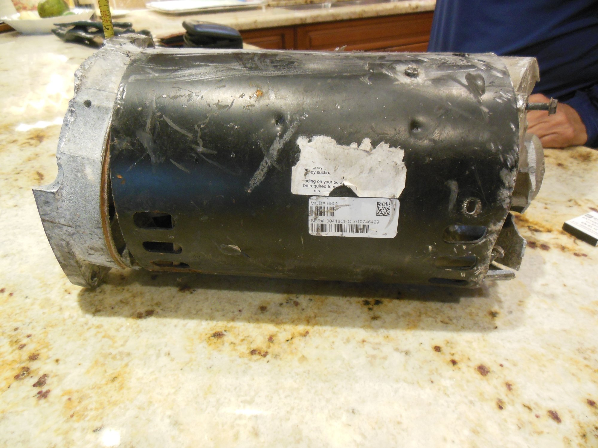 . 2 HP pool pump motor (I think) 6" diameter, square flange 7" Left front side under-door sill lucky on these lines (fuel?) mangled muffler