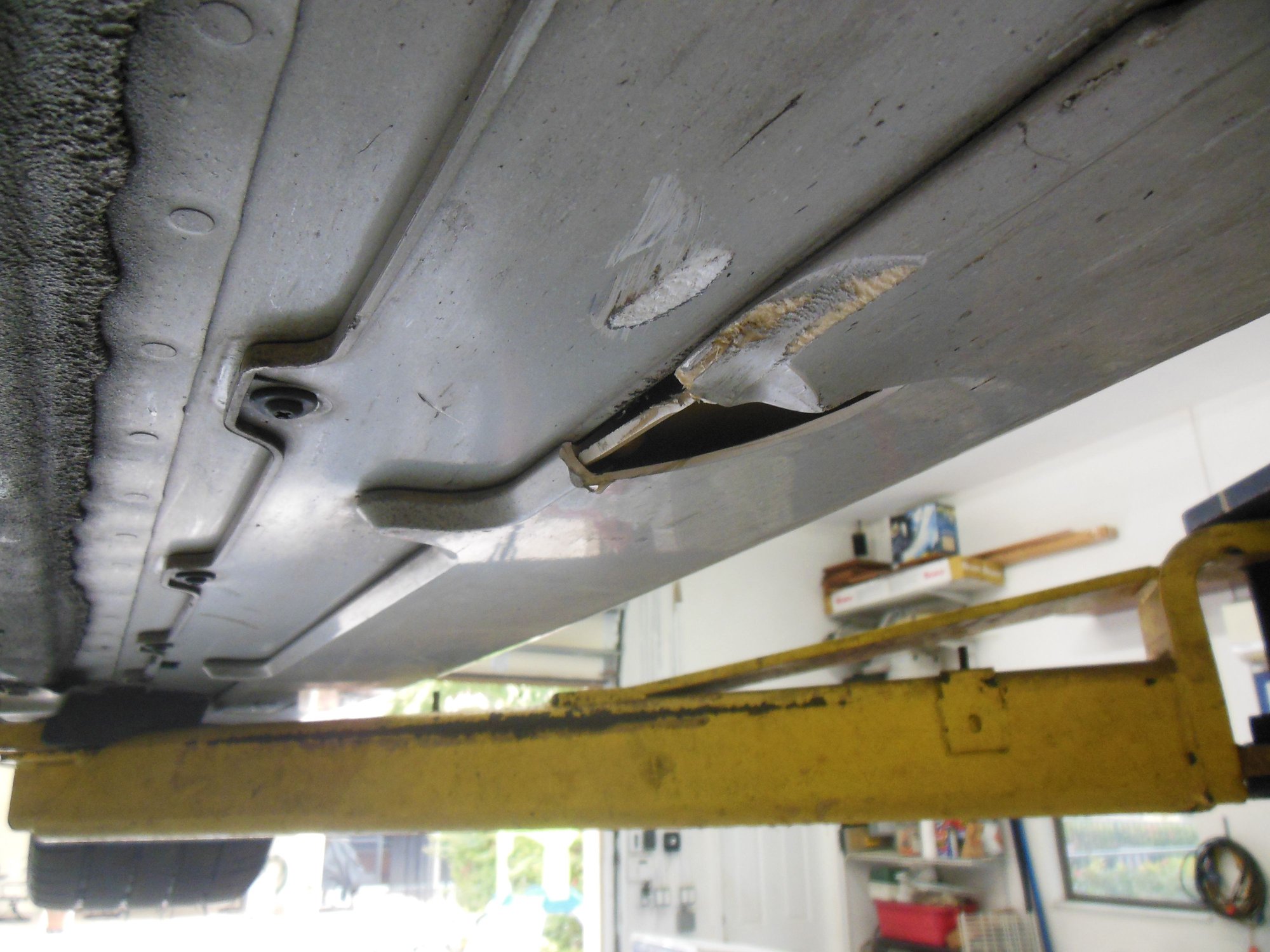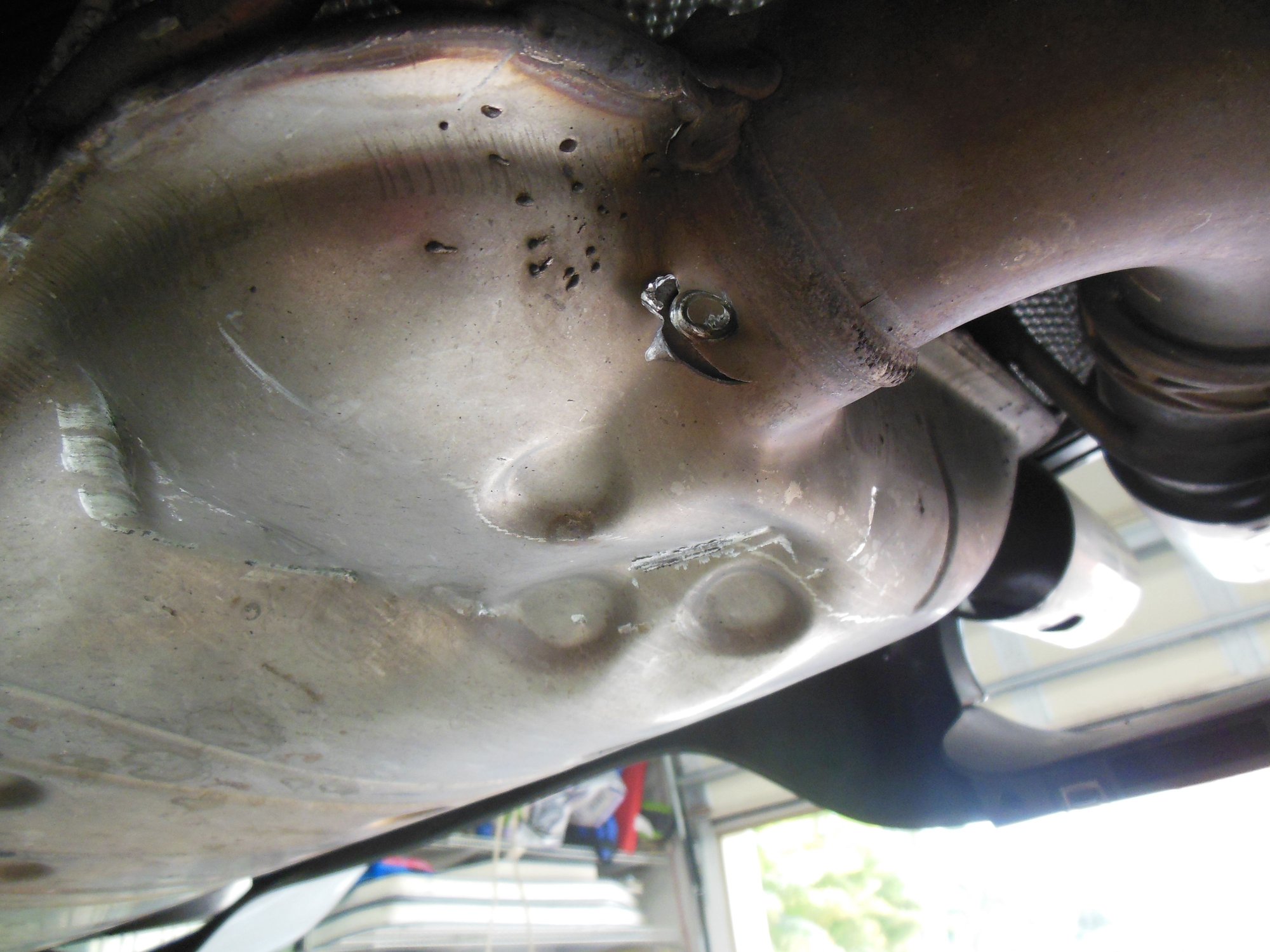 Sorry to hear about your car and health issues. If insurance pays, well replace the exhaust and side skirts. If not, it should be possible to weld the gash in muffler.