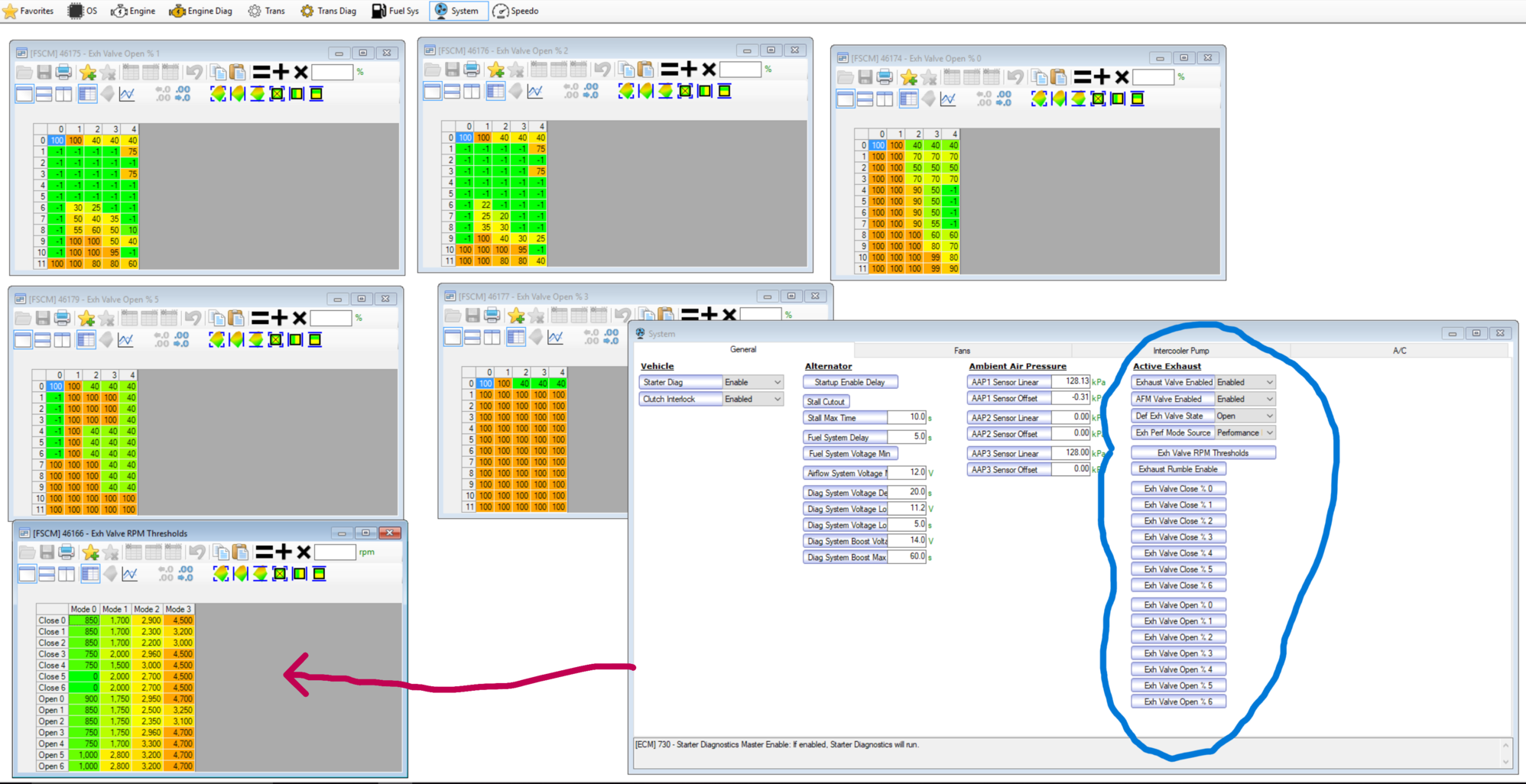 This is an example of the hierarchy data tables controlling the movement of the exhaust flaps, In the lower right, this is the SECOND level access. Each of the greyish bubbles is a data table, once clicked on produces the data in the background tables. In the lower left, is the THIRD level table and showing there is the capability to offer three separate MODES where another FOURTH data level blows out data tables that can be manipulated to change options when and under what conditions the flaps are opened and by how much (as a % of open). With the third level table and as an example, My Aston DB11 V12 has 3 modes - GT, S, S+. When I select any of these modes the ECU switches mode tables which changes the selections of valve opens as a %.