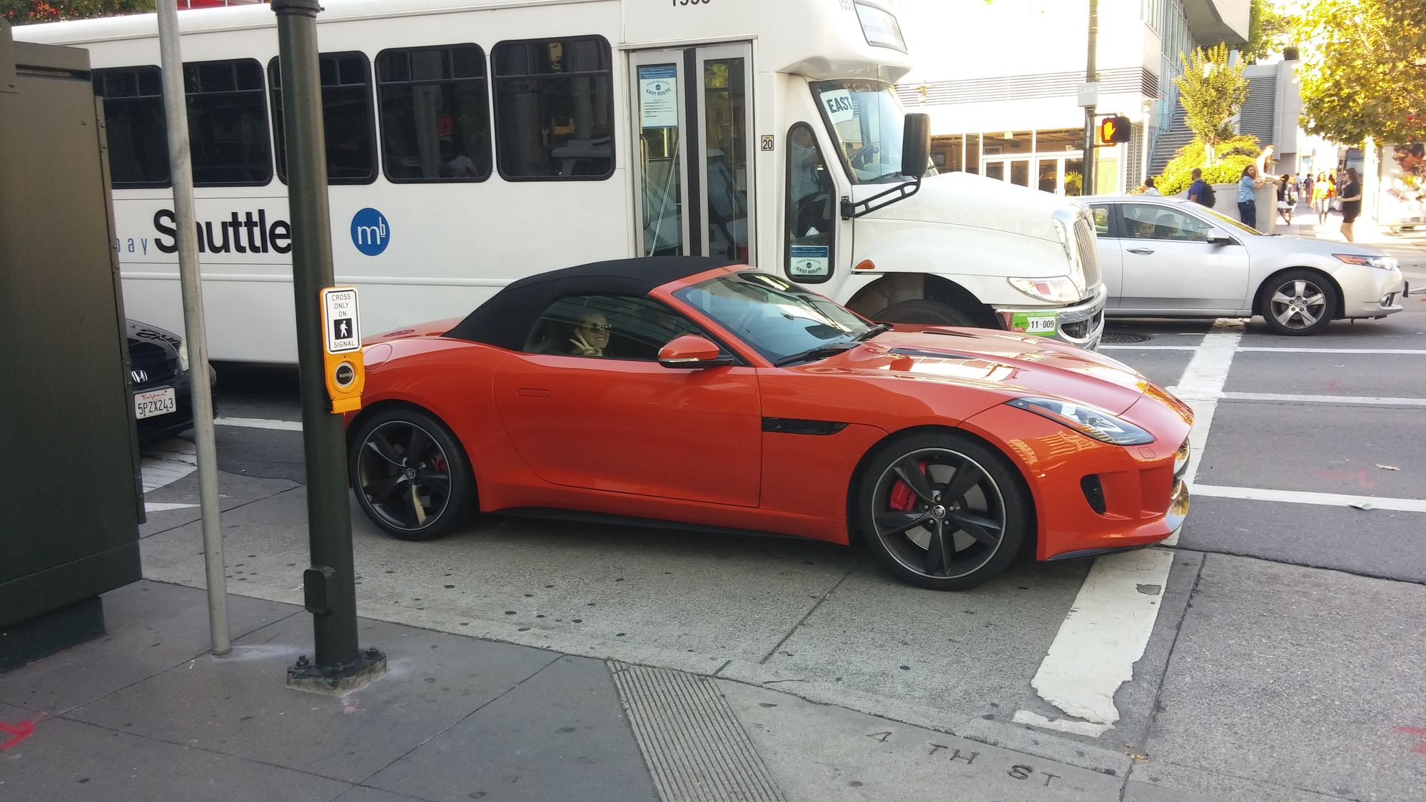 I'm on a roll! Another trip to the dog park, another F-Type sighting. Beautiful high 70s and sunny day, great to have a convertible. Looks like a V8S since it doesn't have matching body rear valance. On 101S near San Mateo (20 miles south SF).