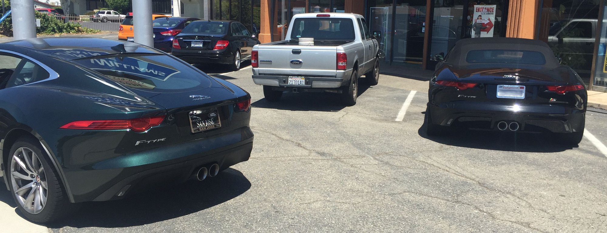 My wife and I were out eating last night at Il Calabrese in Southlake, TX and I used the valet. When we were leaving I saw that my silver coupe was backed into a spot right in front of the restaurant next to a red convertible S and a white convertible S. It's rare that I see a single F Type anywhere much less two others parked right next to mine.