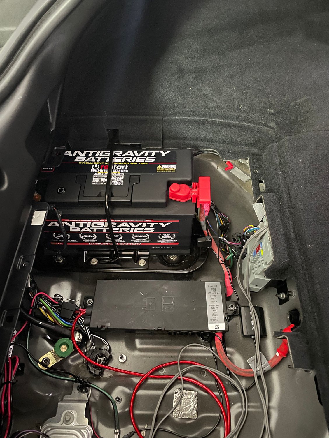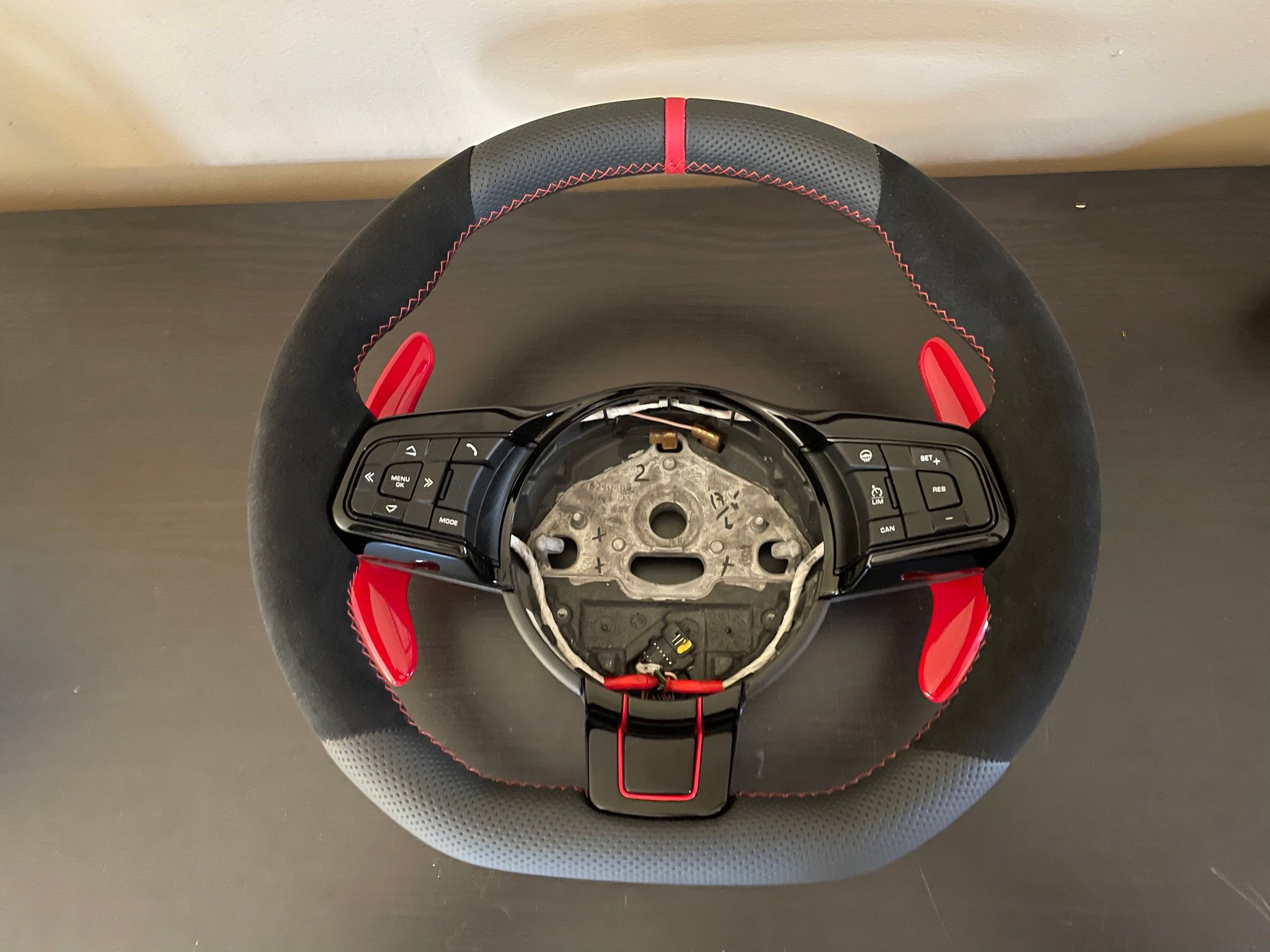 WMI controller installed into dead space behind the armrest. These a huge improvement over the OEM polyprop speakers. Guardian wheel, heated flat bottom, alcantara sides and perforated leather top and bottom. Extended Ferrari red paddles and accents. Mina Gallery Hood vents view from the backside. After replacing them, you’ll notice a ridiculous amount of heat come out from that vent compared to before. Antigravity lithium battery- built in remote jumpstart (has come in handy a few times) and it’s about 40 lbs lighter than the OEM. With the 15mm spacers.