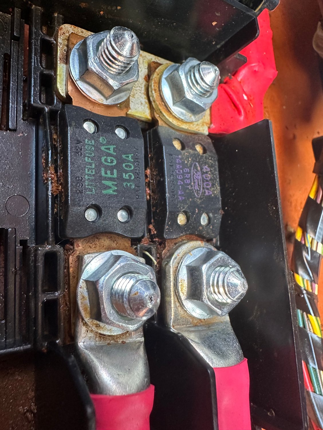 The plastic squares that say something like "350A" are high-current fuses. If one of those blows, you've got a *serious* short, like wires crushed from a crash or maybe a burned up starter. Those should never blow.