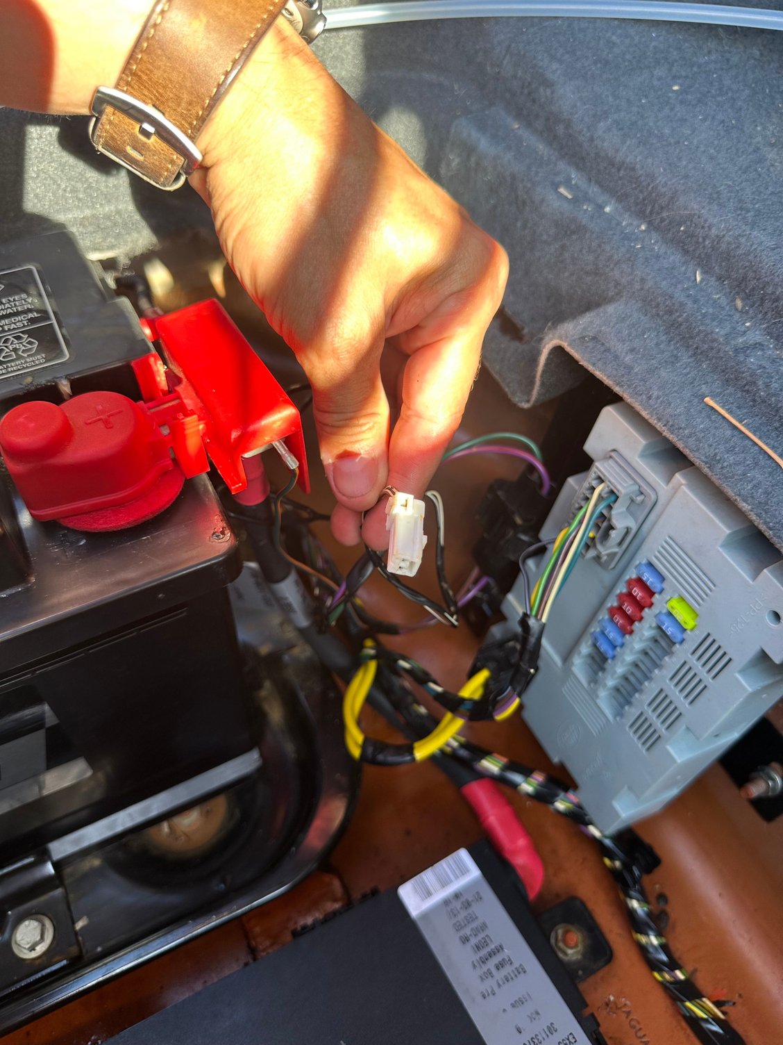 That goes to what's called the transit relay. This is only used when Jaguar ships the cars from the manufacturing plant to the Jaguar dealer. Then as part of the pre-delivery inspection the relay transit is removed permanently. They are SUPPOSE to put that plug in a dead end holder out of the way. But we regularly see this plug floating around in the trunk. This is used apparently on all Jaguars too?