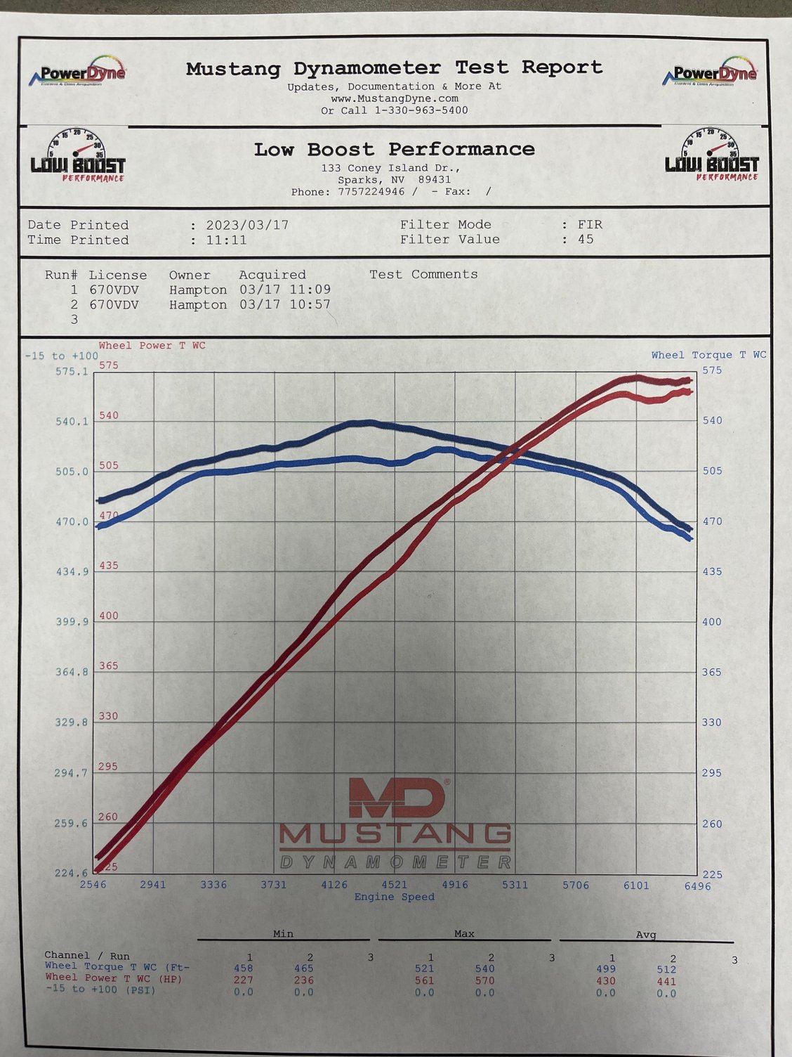 Earlier this winter I ordered the VAP crank pulley and tune. I had a couple of hiccups during the installation, but eventually got everything on and installed. Fast forward a few months, I took the car back out on the road and it was hard to get a “seat of the pants” comparison so I took the car to Low Boost Performance in Reno. The attached printout is weather and altitude corrected. The best result was 570 wheel horsepower using a Mustang Dyno. The calculated crank horsepower based on whatever metrics mustang uses was 700. Interestingly, the lower pull was with the exhaust valves closed and the higher one was with them open. Not a huge difference, but the area under the arc is significant. Overall I’m very pleased with the results.