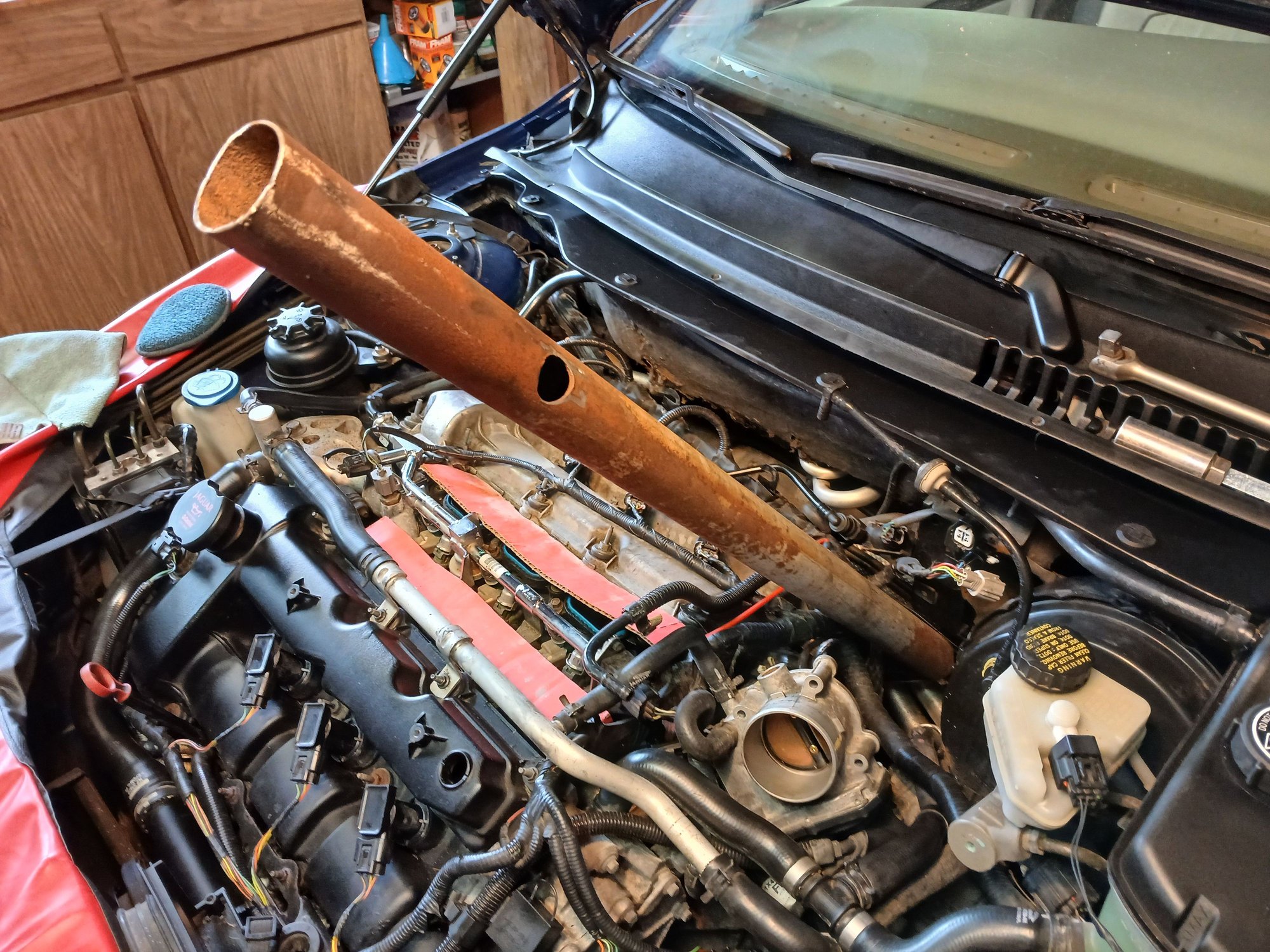 I've had a code for A bank upstream O2 sensor for awhile and had already ordered and received a replacement from Rock Auto that was sitting on the bench. I was getting my Winter car (95 X Type VDP) ready for Fall, replacing plugs and coils and realized that this was the time to finally put in that bank A sensor while I had the intake manifold off, so, I ordered another sensor for B bank for 1/3 off closeout price (Denso) along with two sensor sockets (Performance Tools) and set about. That's when the gremlins showed up. The A bank sensor would not budge with a half inch drive breaker bar, and upon inspection, I found the two sensor sockets had failed.