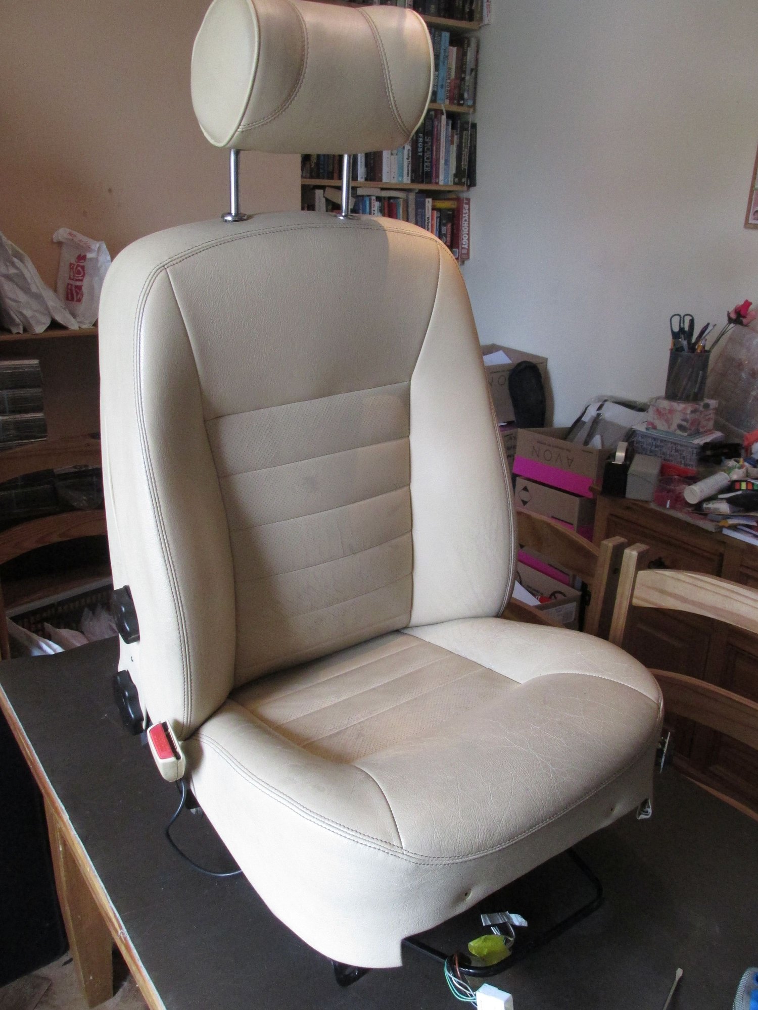 So at least now I have front and rear seats that are matching if not actually finished. I've added pictures of the process for the passenger seat only as the drivers seat was the same. Removal was fairly easy,unplug any connections underneath (they were under the small plinth at the front of the seat) and then undo four torx bolts holding the sliding tracks to the floor. Position the seat 'back' so it leans as far forward as it will go and lift it out. When dying the seats I used a brush to run the fluid into all the seams and stitching and then used a small sponge for the rest...Between three to four coats and then a top coat to seal it. I applied it liberally because if you try and spread it to thinly you end up taking off what you've already put on. Even after four or so coats, once the seats were back in the car I could see areas that needed touching up but I'll wait a while and let the seats get used before going back and touching up any areas that need it.
