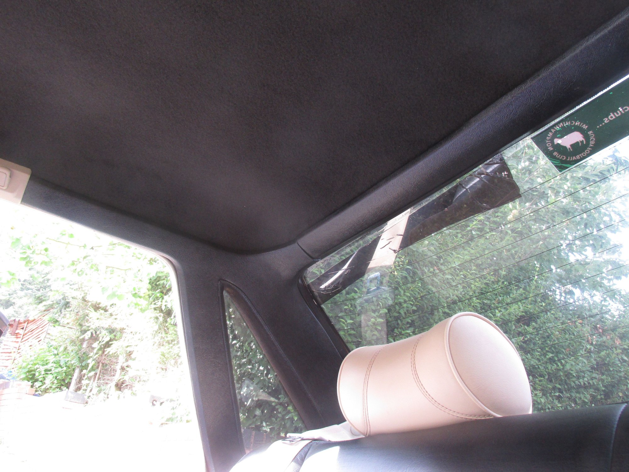 The red was some left over CGG spray form an X308 I had a few years ago. Application was with small sponge and a 1/2 inch paintbrush for the crevices. Probably left about 20mins between coats as if you leave it to dry completely you can end up taking the dye back off with the fresh coat. Seats took about 4 coats and the trim less. The headlining came out in one piece through the passenger front door,had to bend it a bit but it didn't break and any creases were covered over with the new fabric. The fabric was what you might use to line a van,with a self adhesive backing,actually took about 10 mins to attach to the old 'biscuit' or whatever it is called. Way cheaper than buying a new one and does the job nicely.