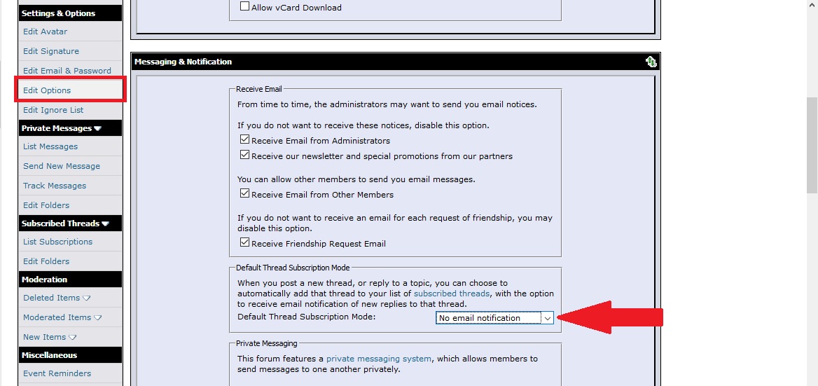 Same problem. How do I change the email notification for a thread I've already subscribed to, from "daily" to "never"? Or from "never" to something else. Etc... I know you can set the default option, for new subs, but I don't see how to change the notification preference for an existing sub.