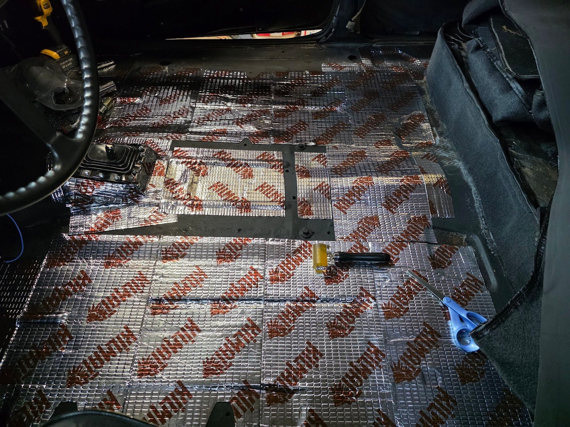It was a busy day today. I put the sound deadening mat on the firewall, covered it with the EPDM closed cell foam, and put the carpet in place.