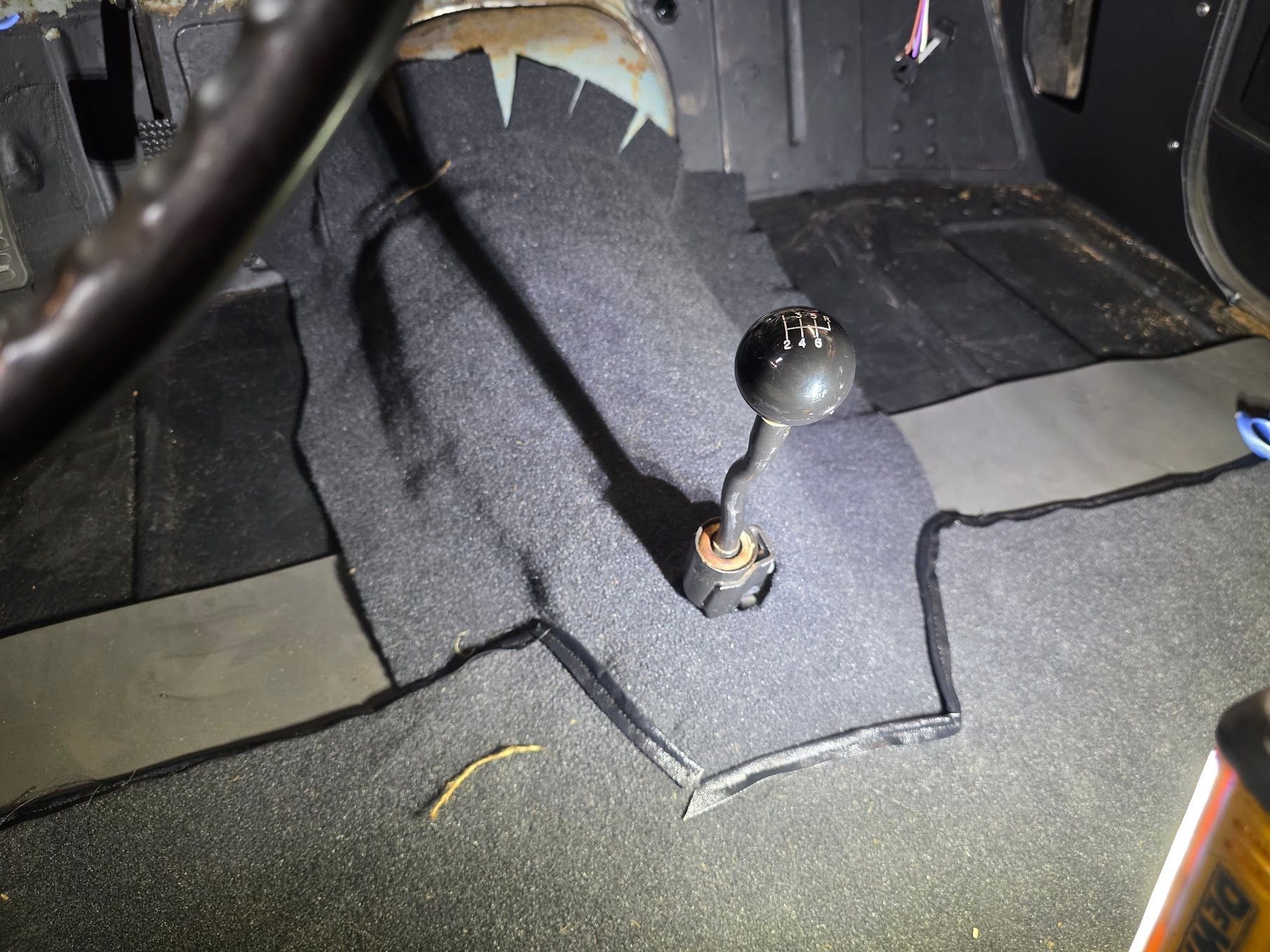 Tonight I finished up the section of carpet that covers the firewall and the front edge of the transmission hump. Then I threw the original front mats down to see how it all fits.