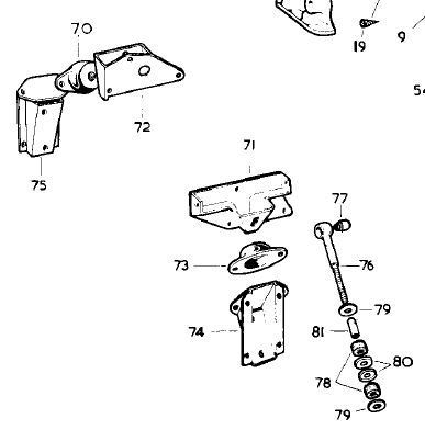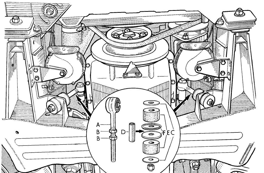 A ~ goes through a hole in the bracket you can see in the diagram above that is part of the crossmember with C,E,F on either side & metal spacer D controlling the compression you apply to the rubbers. You do up nuts B tight on either side. F are cup washers.
