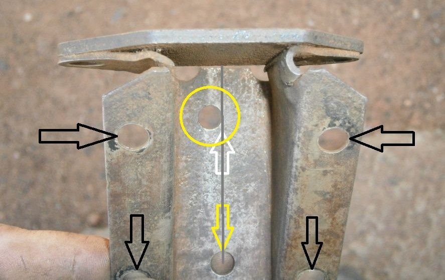 The upper hole circled in yellow is hole we are interested in as you can see from this photo when judged against the vertical line it is off set to the left. Neither of these holes are actually used to bolt anything to.