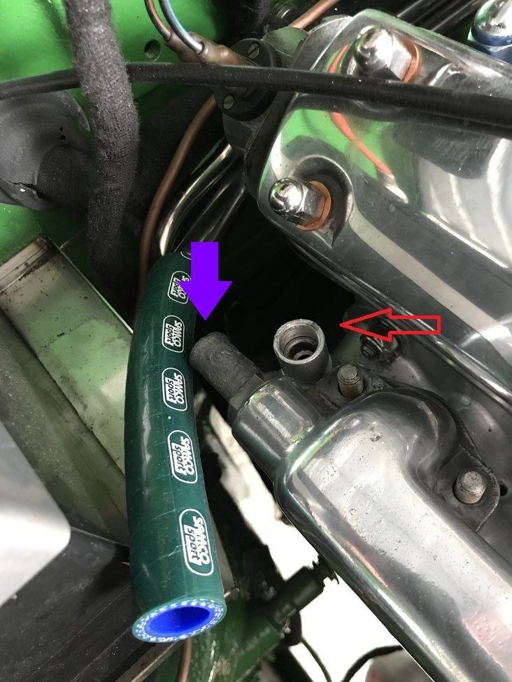 From your photo, a metal pipe with a barb end screws into the port with the red arrow, this is for manifold vacuum and goes to the brake booster. The purple arrow is for the heater circuit, the other end of the heater goes to the nipple on the back of the waterpump.