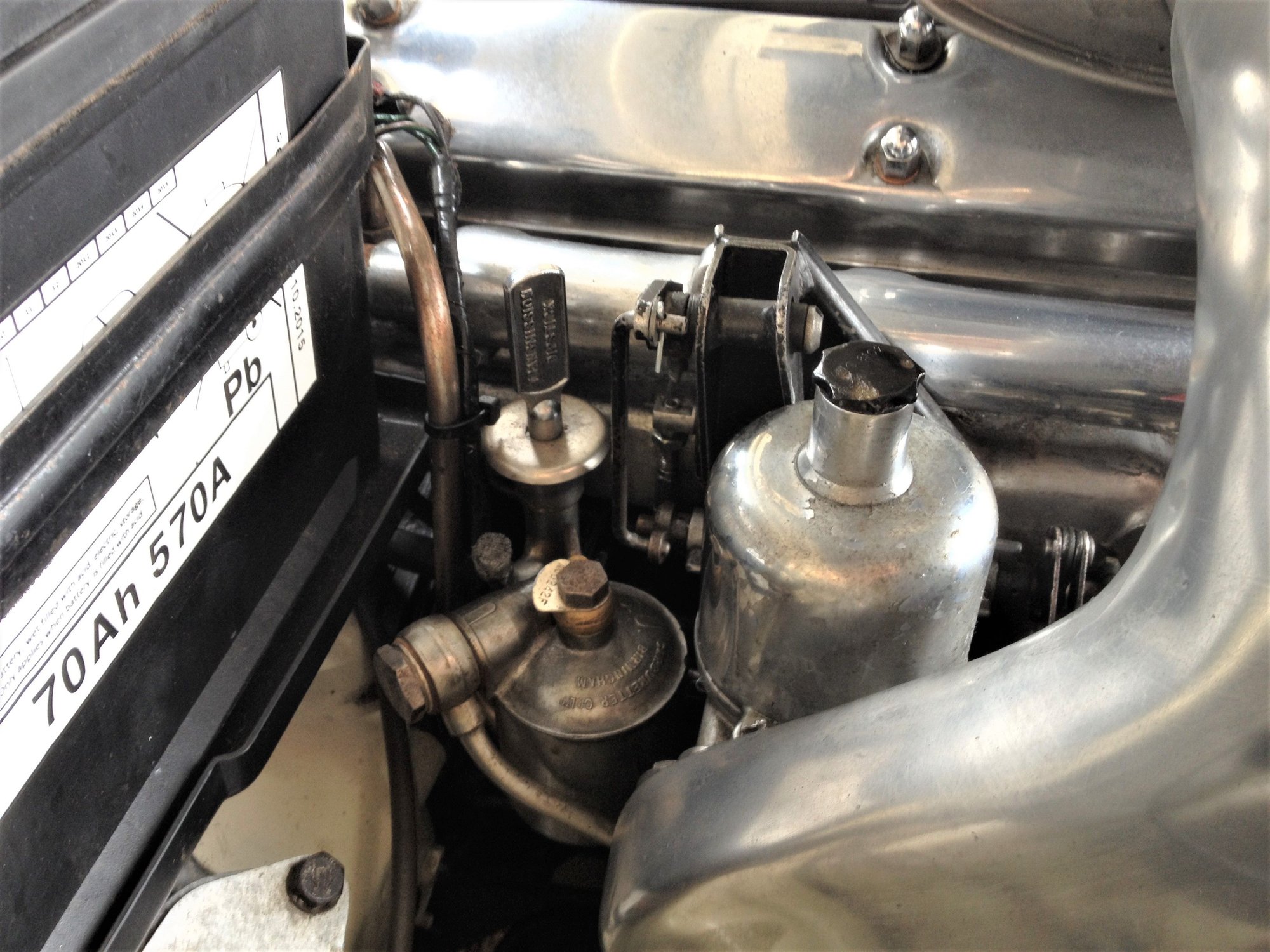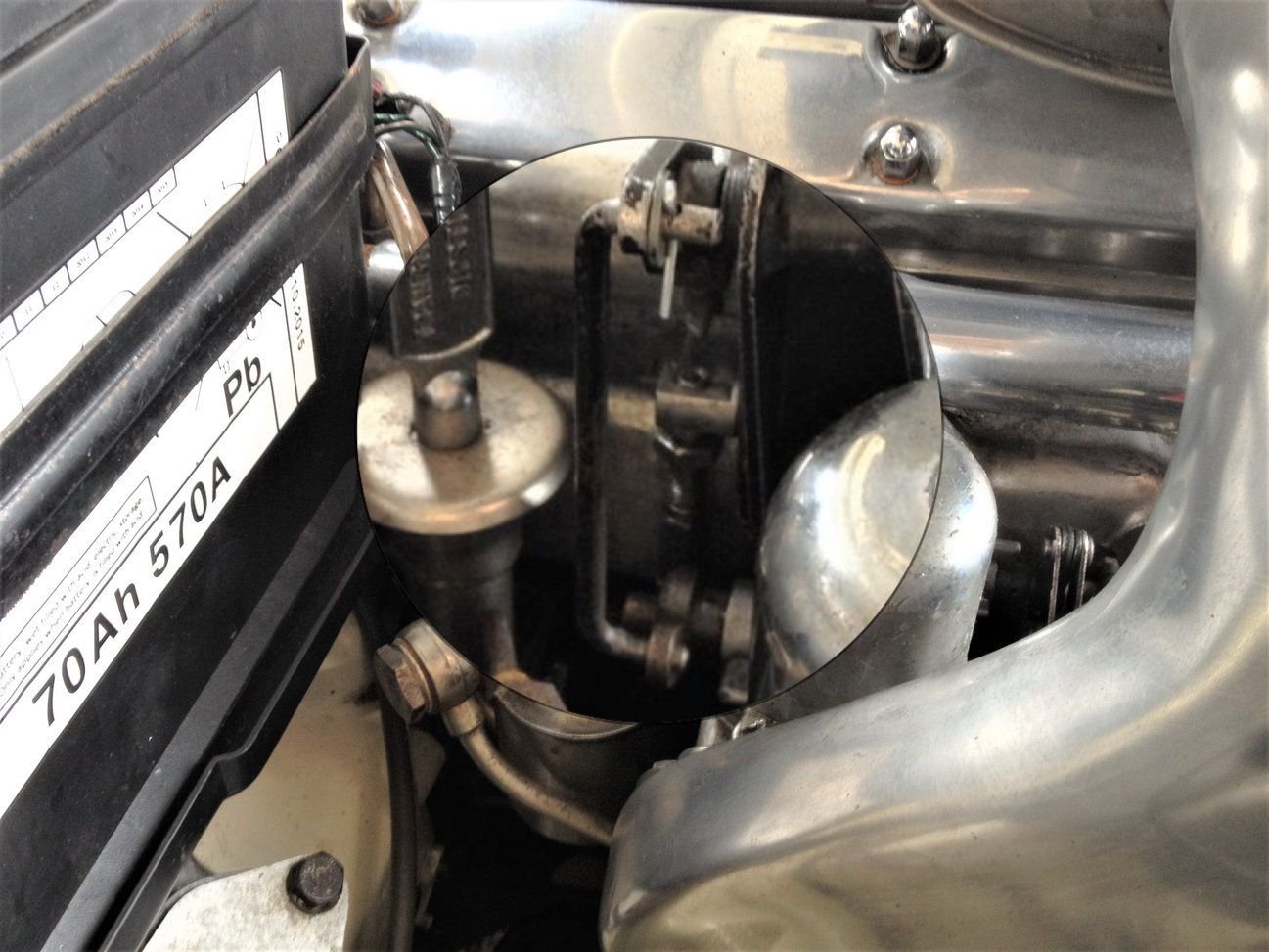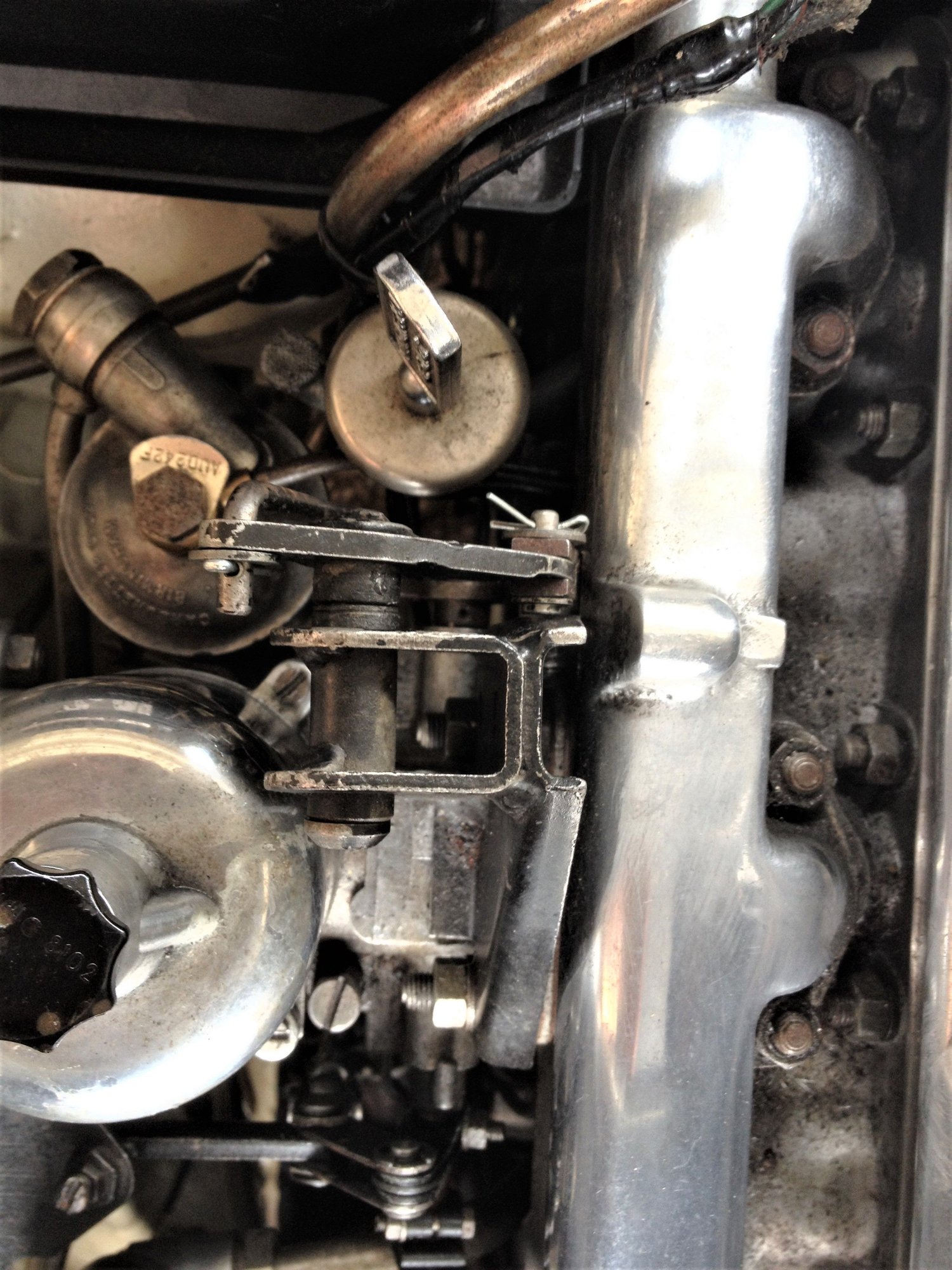 Cass3958 rear carb with magnifying loop around the clevis pin attachment to kick down cable Cass3958 side view. Pre-restore showing front carb but no auto linkage that I can see. Image from addendum CC.s.1 Linkage fitted to front carb, the only way round it will fit Kick down cable "miles" away from reaching the linkage plate either over the engine or around the back over the bell housing. Linkage fitted to front carb, only way round it will fit and leaving the "S" shaped rod directly over the throttle link