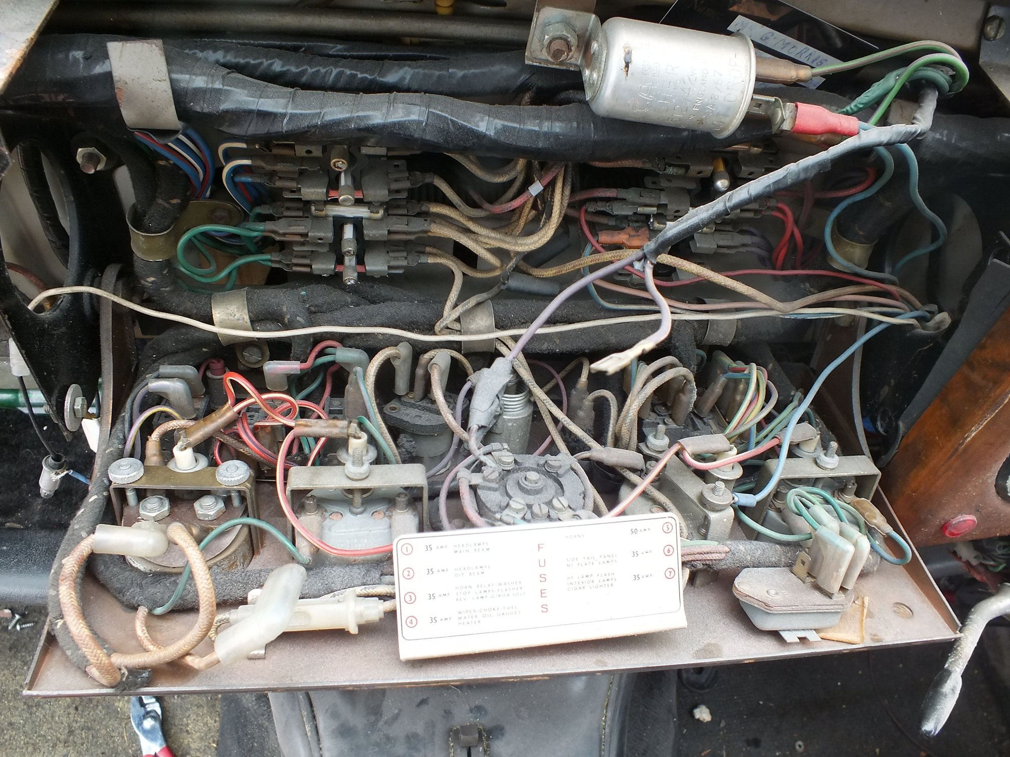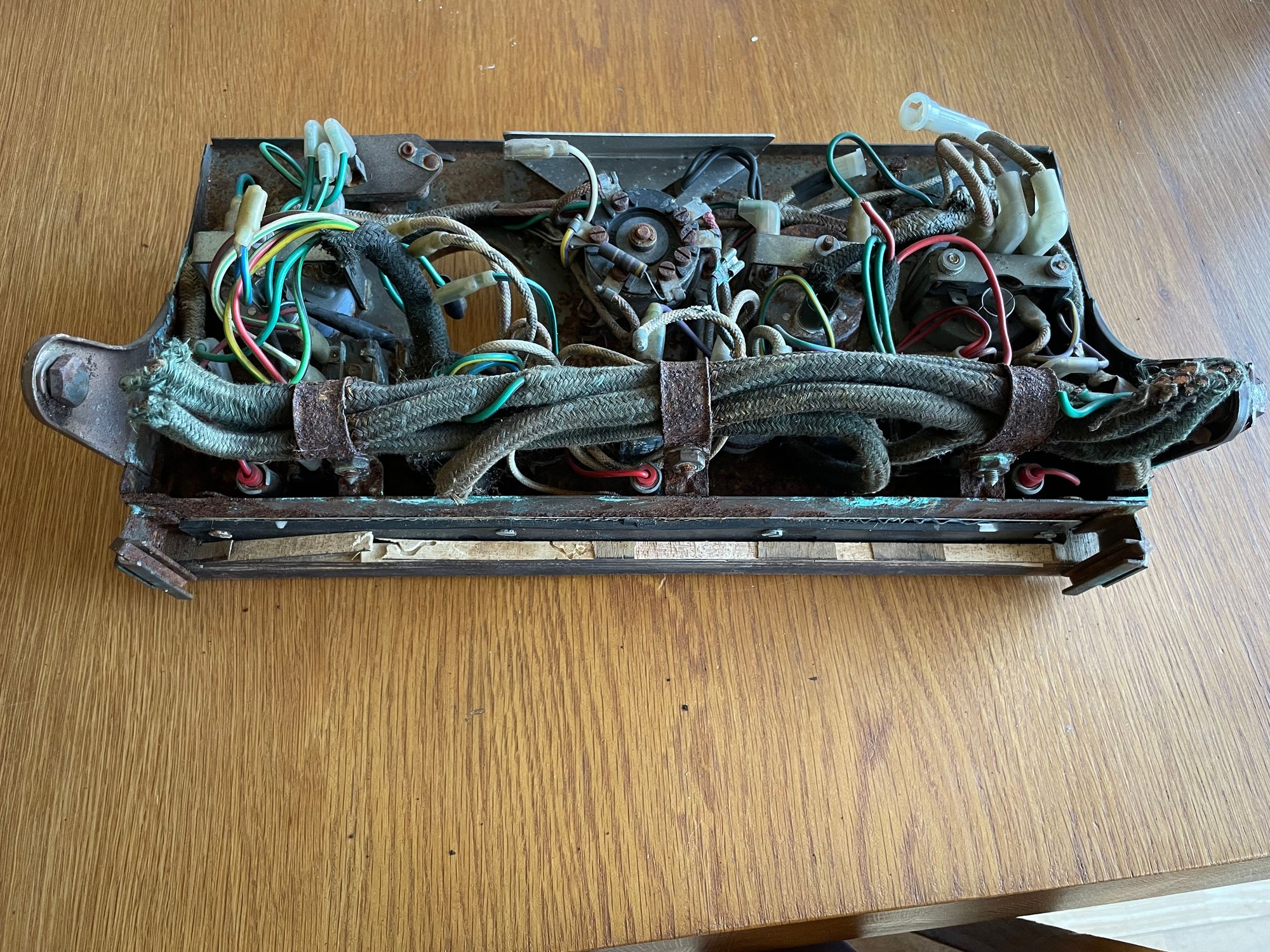 In the first photo with all the wiring in place it is difficult to make out where the bulb holders are and this is with the facia out of the car. Each bulb is being supplied with a red wire under the main wiring bulk at the bottom of the photo.