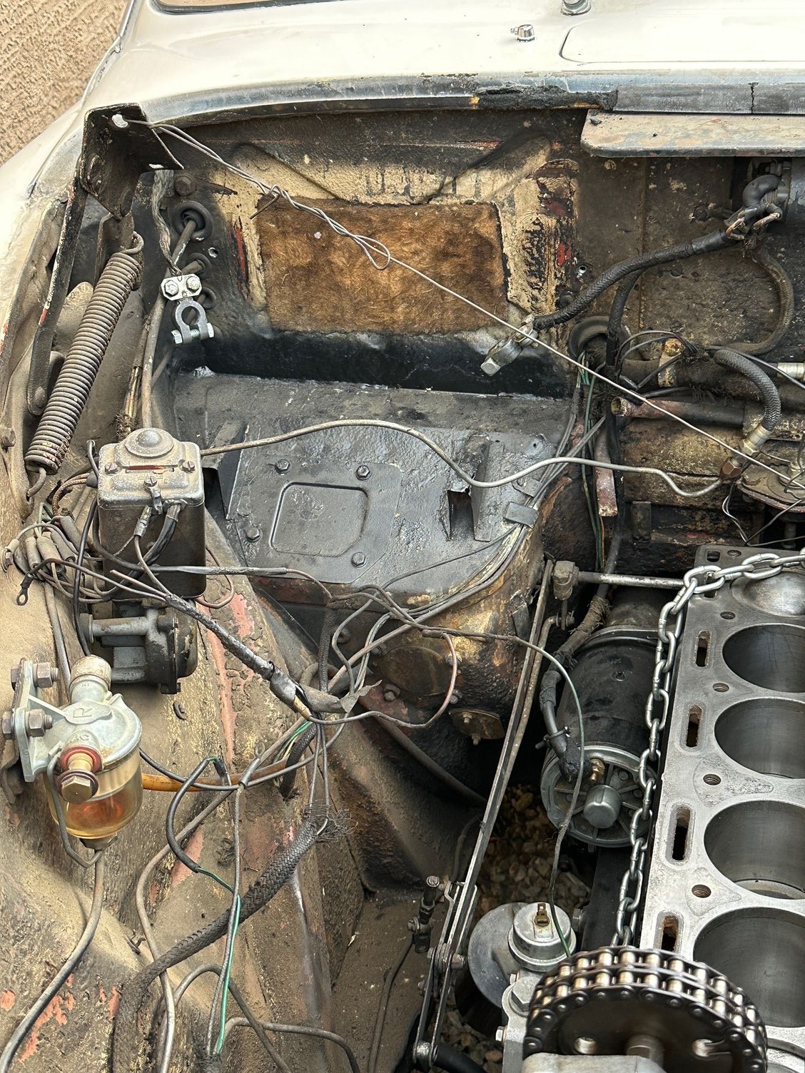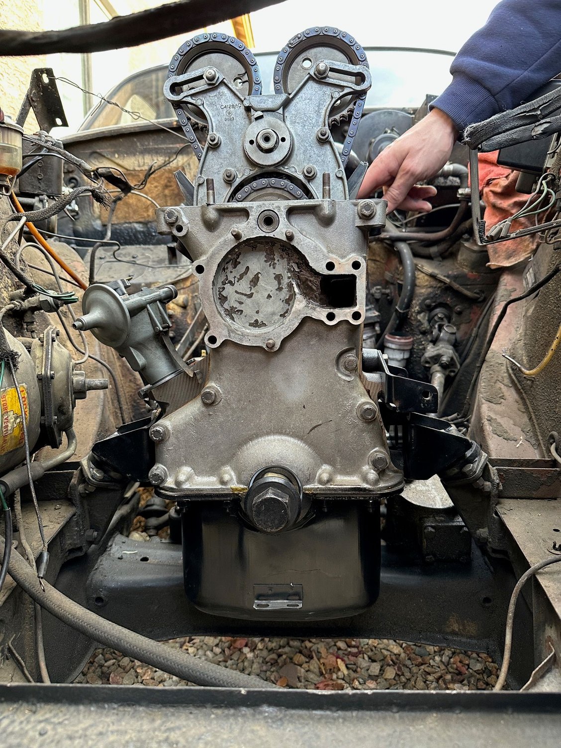 That engine looks like it has been through an overhaul. Note the shiny pistons, missing cylinder head studs and clean timing chains.