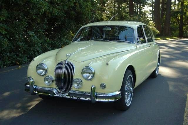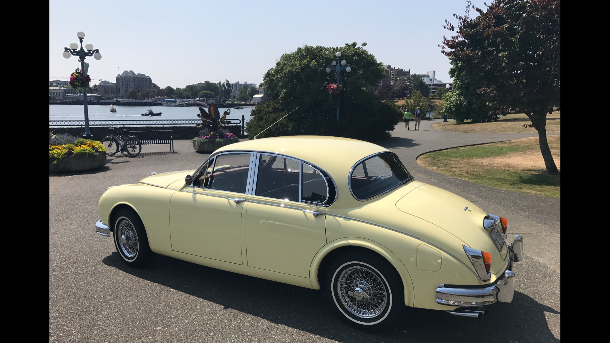 The car is in its original colour of Pale Primrose (introduced in the Mk 2 palette in 1964) but in base coat/clearcoat formulation. On purpose I left the trunk and the engine compartment as it was in the factory paint, and I decided not to bring the engine compartment to the same standard as the rest of the car. I have done that on too many Jags (V12 XJ cars mostly) and found that I was reluctant to use those cars as often or as hard as I wanted. This one is used all year long (today in fact for a lovely 2 hour winter country run) as long as the roads are dry. It is even used for grocery shopping (I can see the expression on your face, but so far the car has not acquired even a single mark on it...perhaps I shouldn't have said that....).