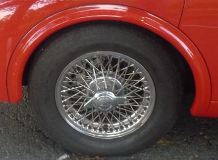 The original wheels were painted steel. I fitted instead chrome tubeless Dayton wheels and radial tires in the original size with 1966-correct white band. (Every Jaguar sold in Canada, including E-Types, up to 1982 was factory -fitted with whitewall tires. The band width depended on the width in vogue at the time. The 1965-66-67 width was quite narrow).