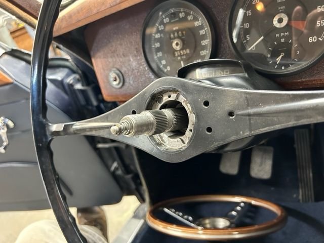 Seems like an easy one but I can't seem to figure it out. I purchased an aftermarket wheel for my 340 and was told I was sold the correct boss to mount it. The problem is the new wheel will slide down the splines to the point I have a spear pointing to my chest. I have the adjustable column and have tried putting the nut on with the column in but all it's doing is forcing the wheel to the bottom of the splines. The picture shows my original wheel doing the same thing. It was fine until I removed it.